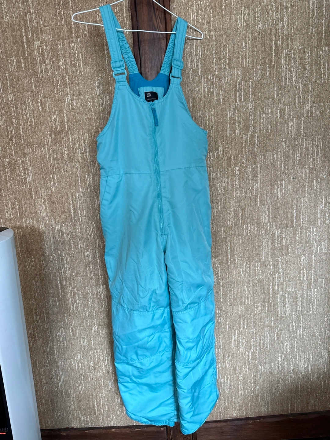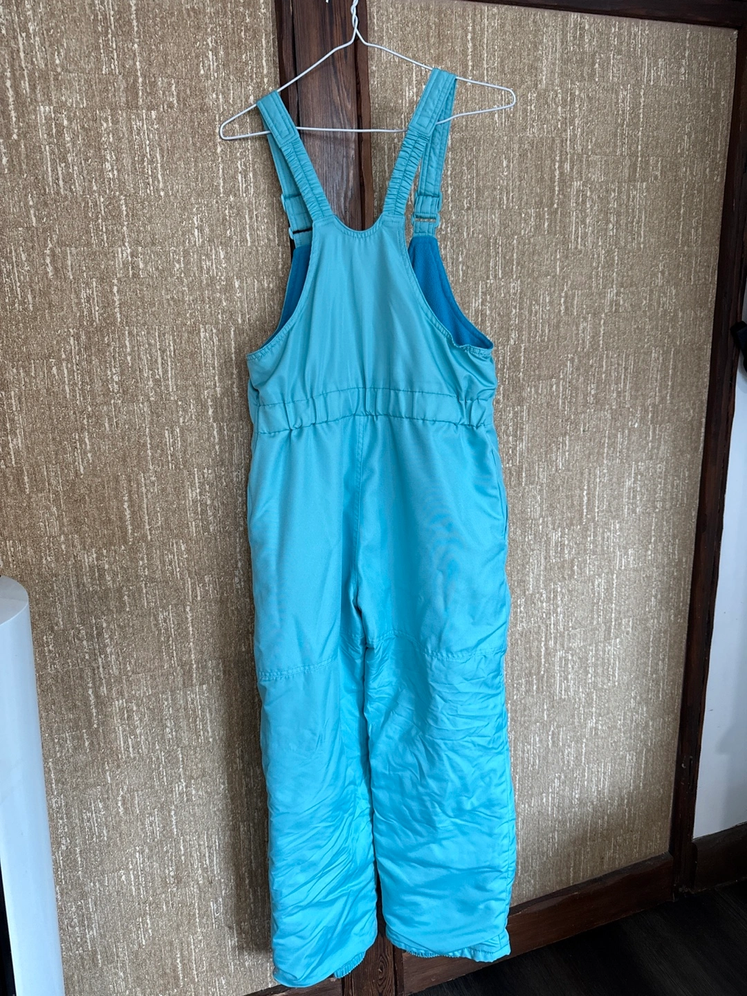 Girls' snow pants. Teal colour. Size XL (14/16). Water and wind resistant. Good condition.