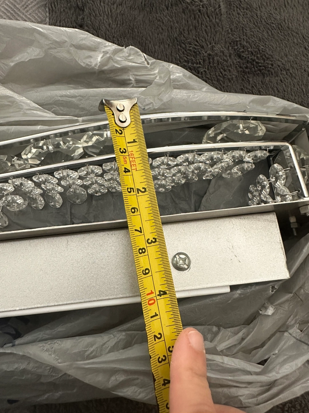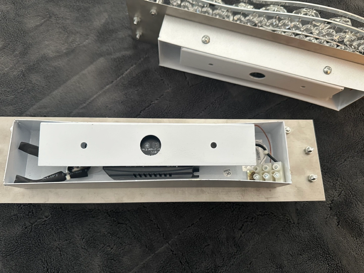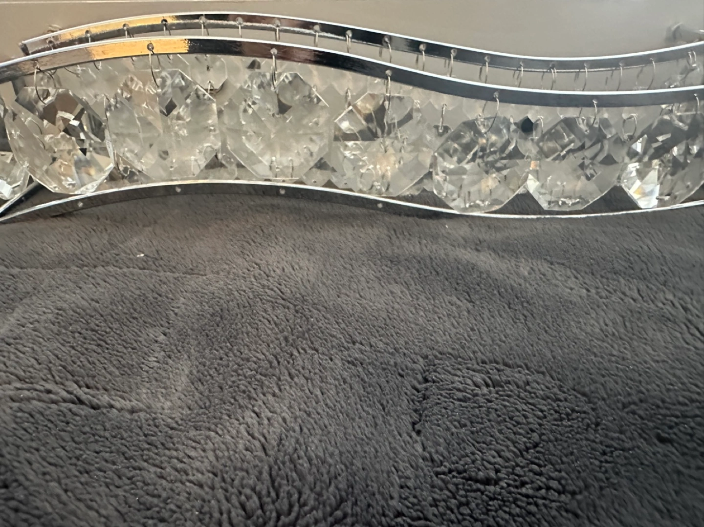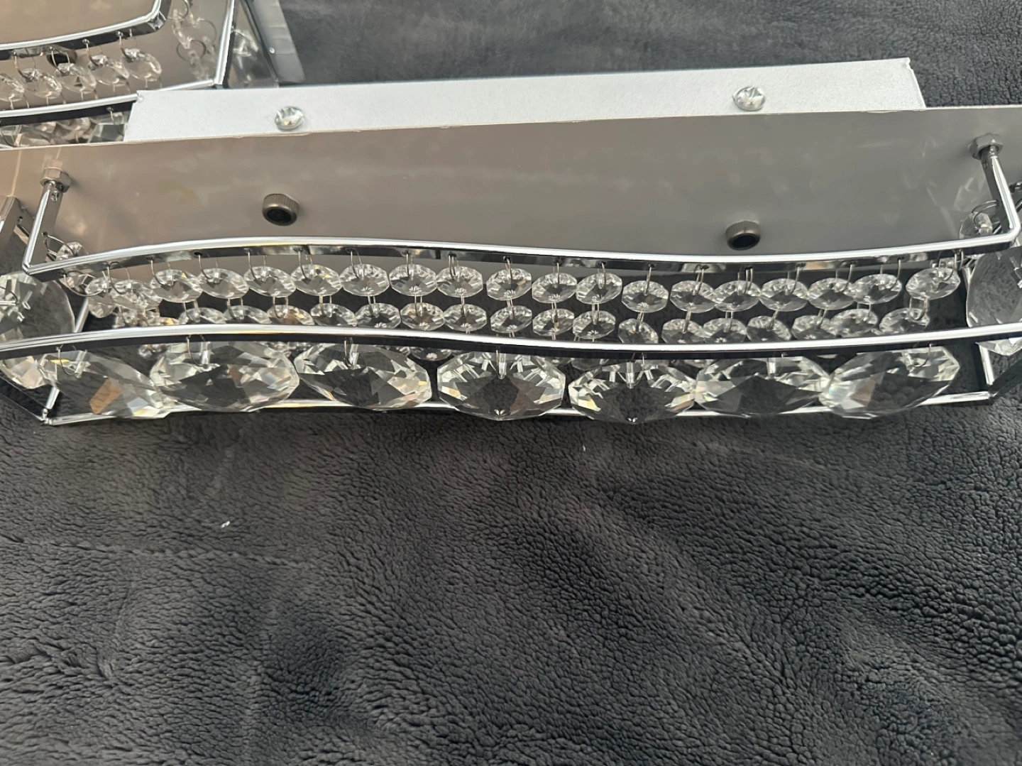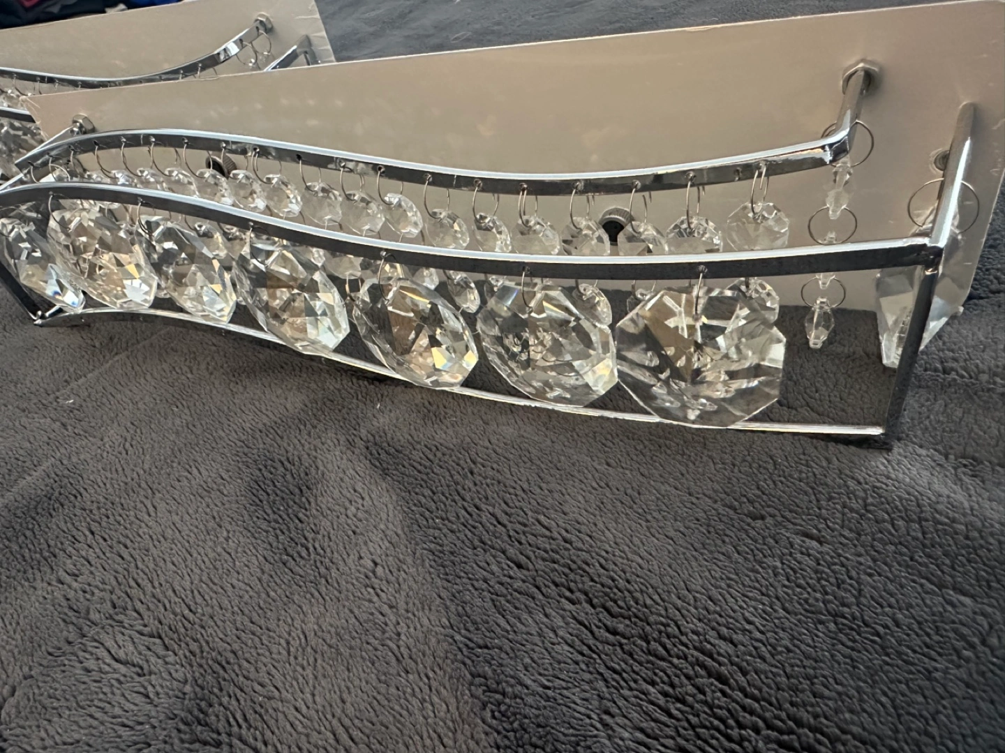 A pair of matching modern vanity light fixtures. Brand new, never installed (the plastic film still hasn't been taken off on the back board). Chrome finish. Beautiful design features shimmering crystal accents !!