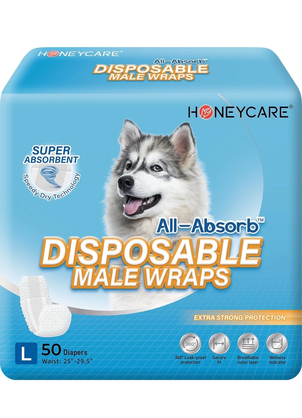 New Pack 50 count package of Honeycare disposable male dog wraps. Size large, fits waist 25-29.5 inches. All-Absorb, extra strong protection. Features 360° leak-proof protection, secure fit, breathable outer layer, and wetness indicator. Ideal for incontinence, puppy training, travel, and more.