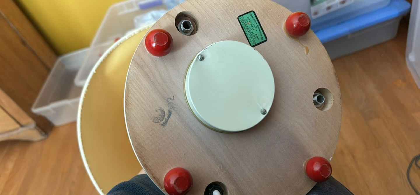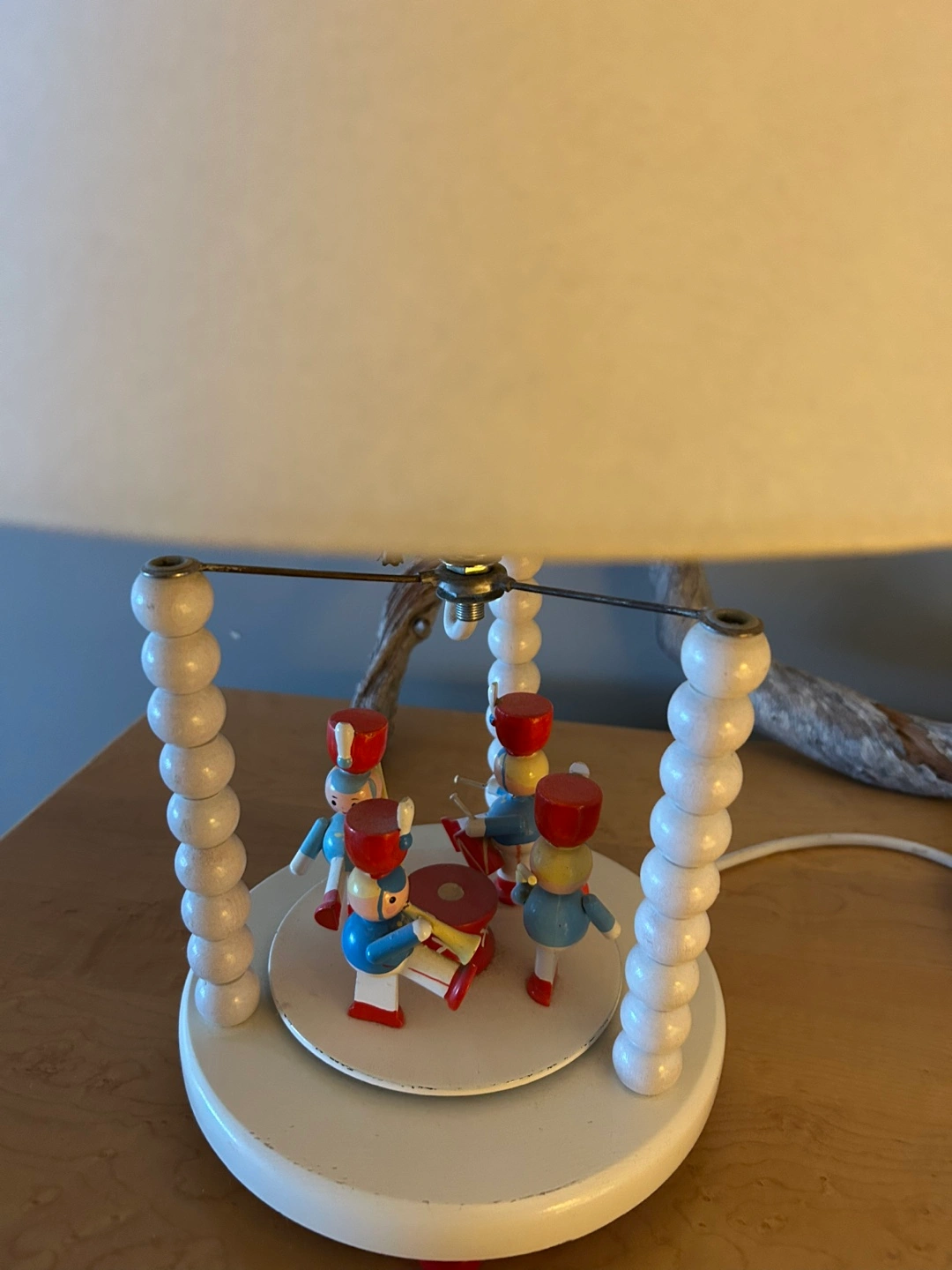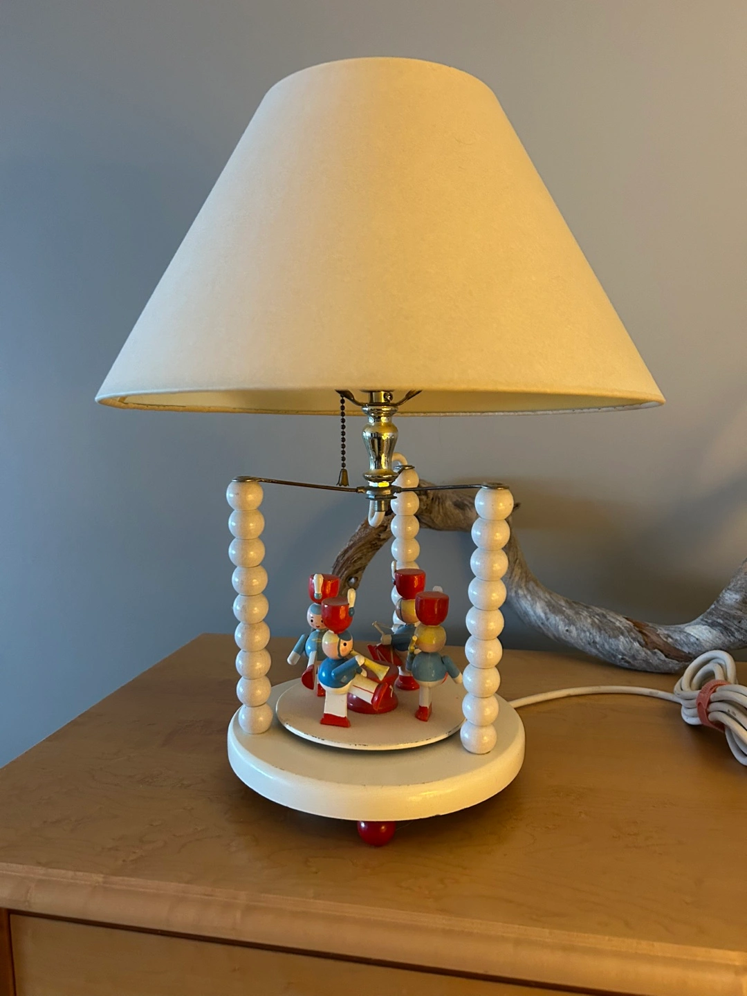 Nursery Plastics Inc. vintage 1960s. This is a musical children’s nursery lamp. Features a rotating base with small wooden figures playing musical instruments. Works. The musical stage and music skips so it needs a bit of service. Even without the music and spinning stage of drummers, it’s very cute and rare. Overall the paint is in very good condition. 8” diameter base; 8 1/2” tall to top of scalloped posts. 17” overall height with lampshade in picture. comes with shade if wanted. Kanata (Ottawa). Will ship. Unique vintage table lamp. Cute and whimsical design. Ideal for a child's room or collector.