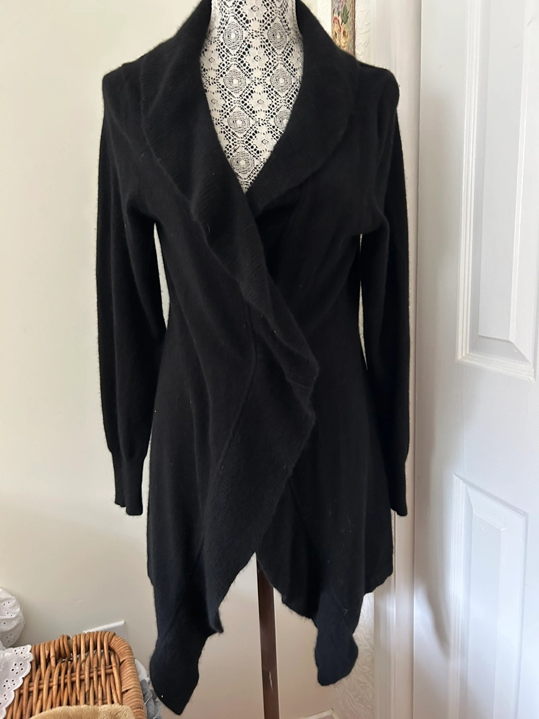100% cashmere cardigan. Black. Size m/L Asymmetrical design. Long sleeves. Two buttons.