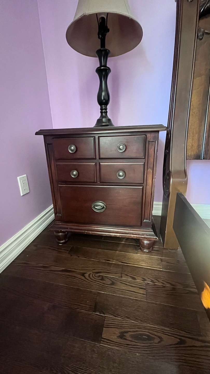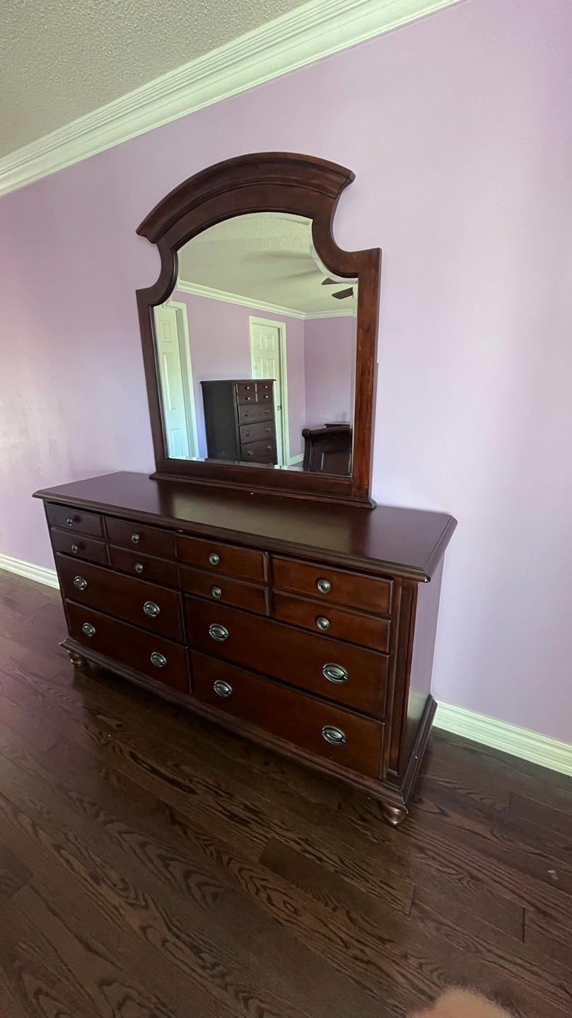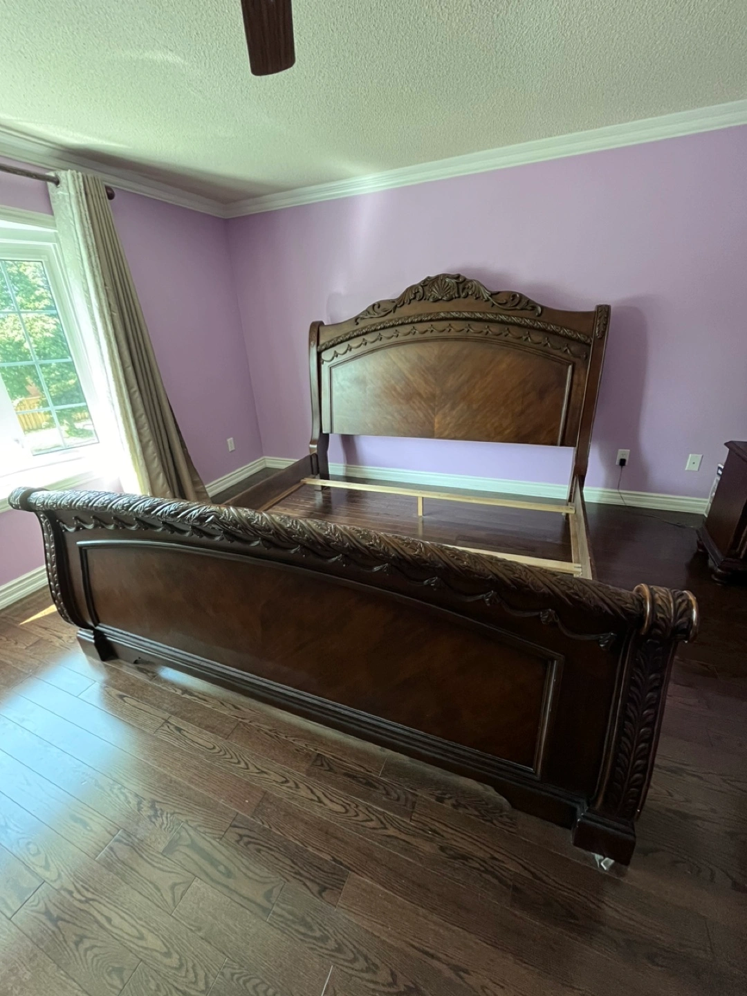 Beautiful dark brown sleigh bed frame, includes headboard and footboard. Matching dresser, mirror and nightstand. Intricate carvings and a rich finish. Solid wood construction.