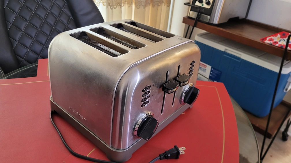 Four-slice toaster. Stainless steel finish. Features include bagel, defrost, reheat, and cancel settings. Independent controls for each side.