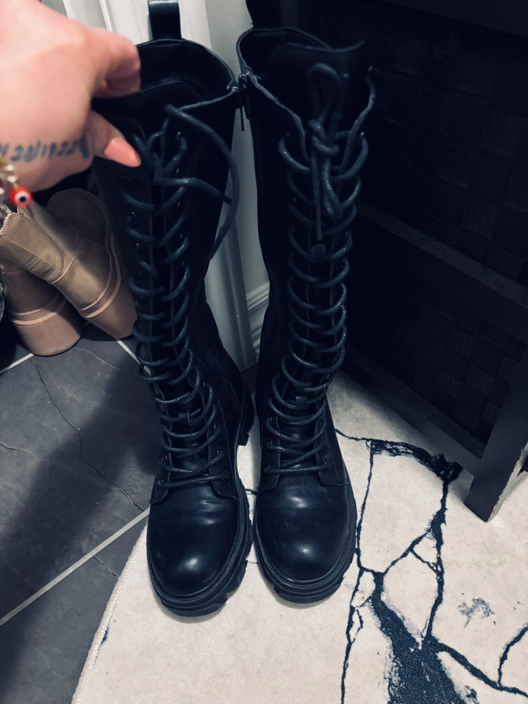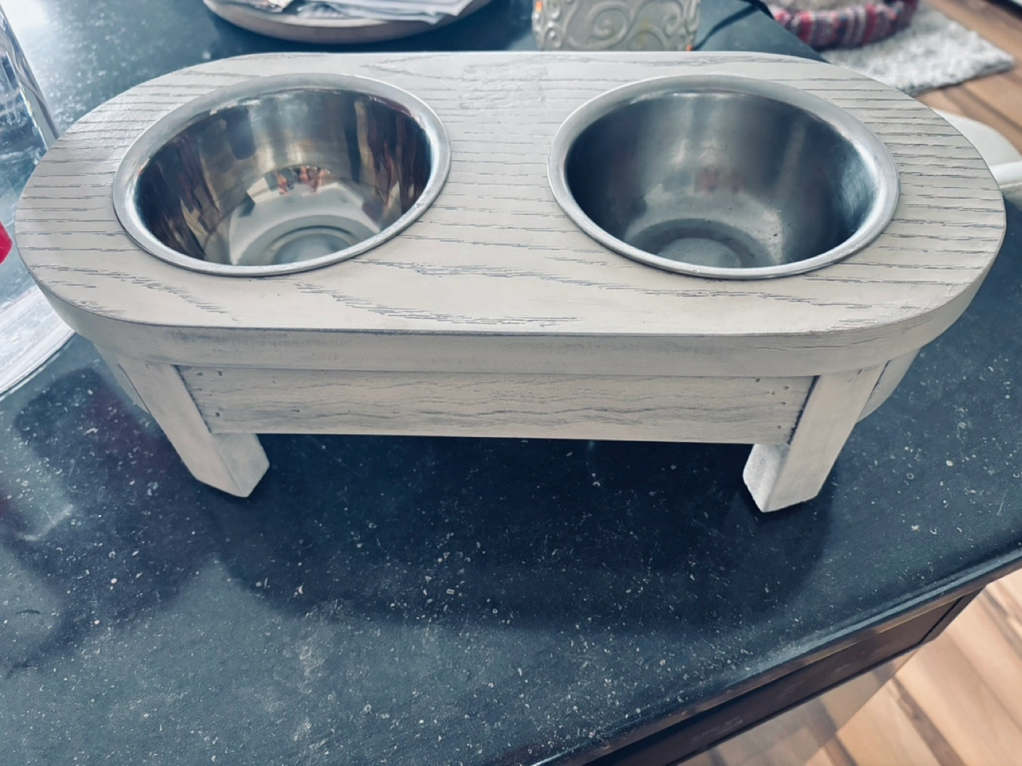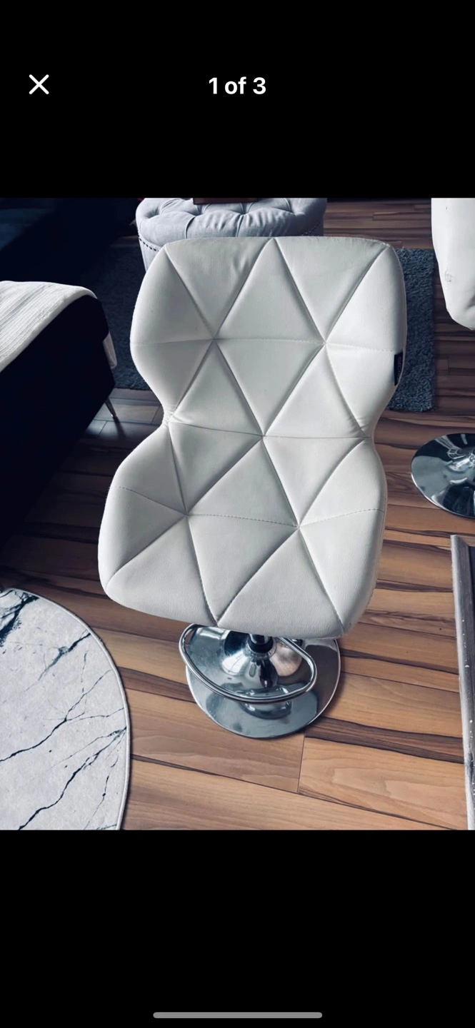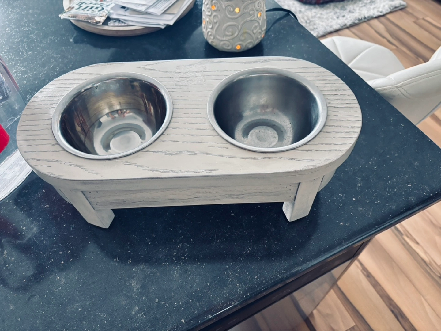 73Three items for sale: Black leather knee-high lace-up boots. White bar stool with chrome base. Wooden pet feeder with two stainless steel bowls. Great condition.