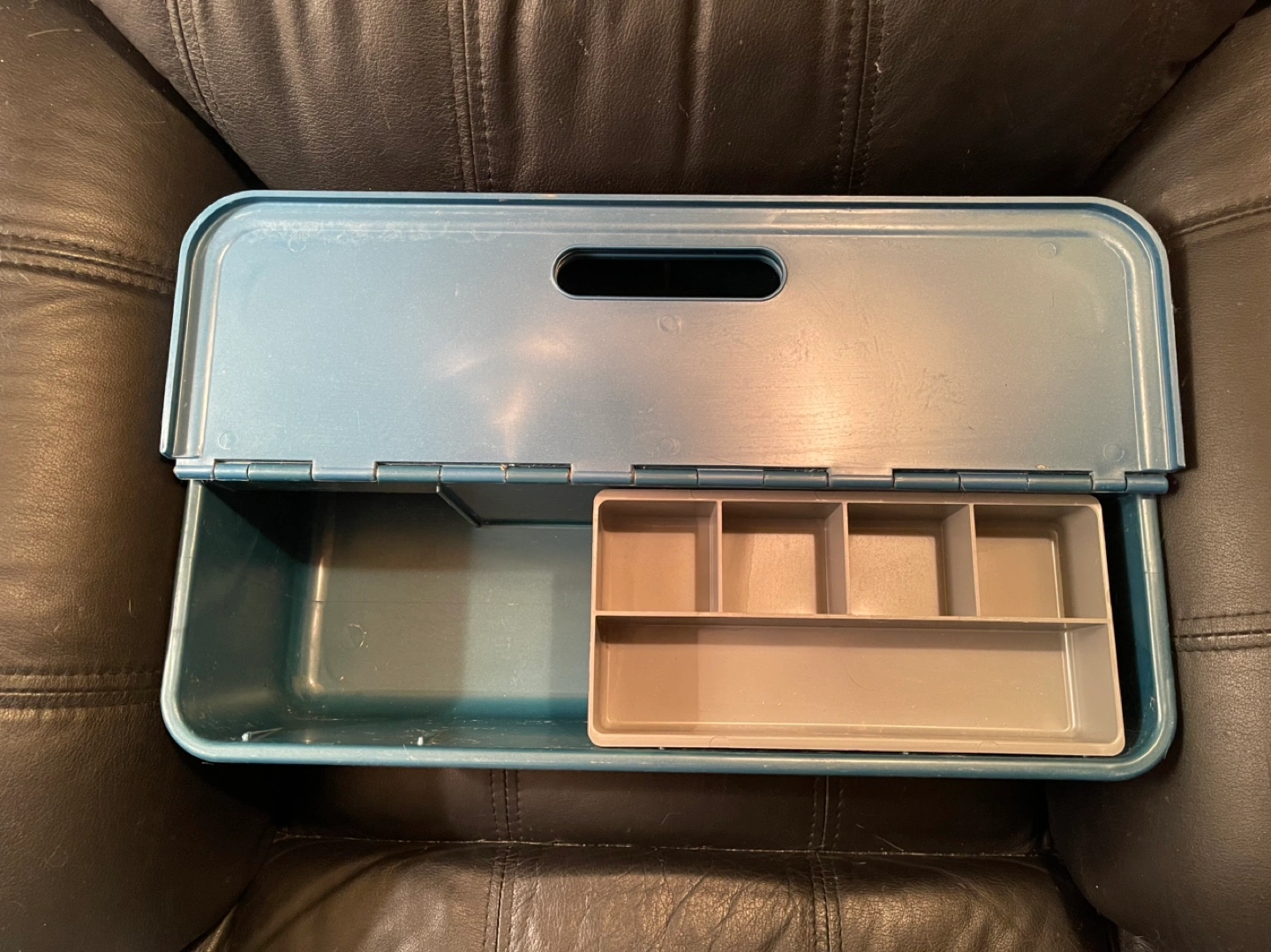 Features a removable sliding tray with compartments. Inside tray measures 9.5 x 4.75 x 1.75". Very good condition with no cracks. Great for use as a toolbox or storing craft supplies, etc. Price is firm. Cash only.