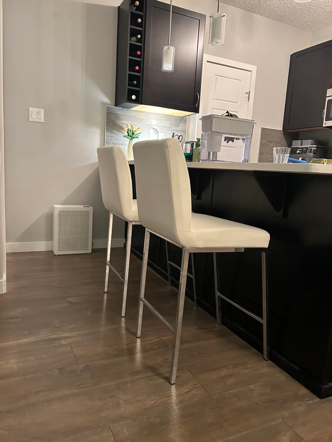 Bar stools. White leatherette seats and backs. Sleek chrome legs. Modern design. Great for kitchen island or bar.
