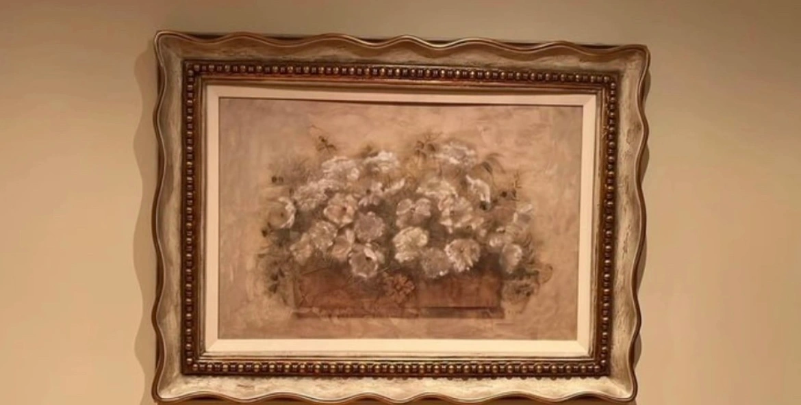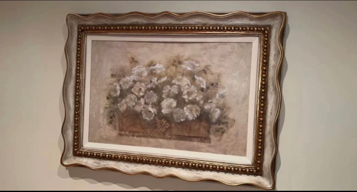 Beautiful framed floral wall art. Features a lovely bouquet of flowers in muted tones. Ornate frame. Great for adding a touch of elegance to your home. Dimensions: 47L x 36W.