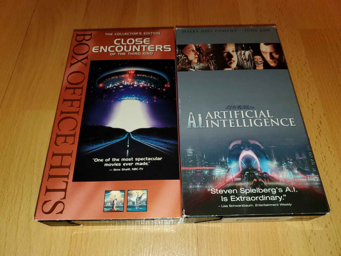 Two classic Steven Spielberg films on VHS: A.I. Artificial Intelligence and Close Encounters of the Third Kind Collector's Edition. Both tapes are in good condition and still playable.