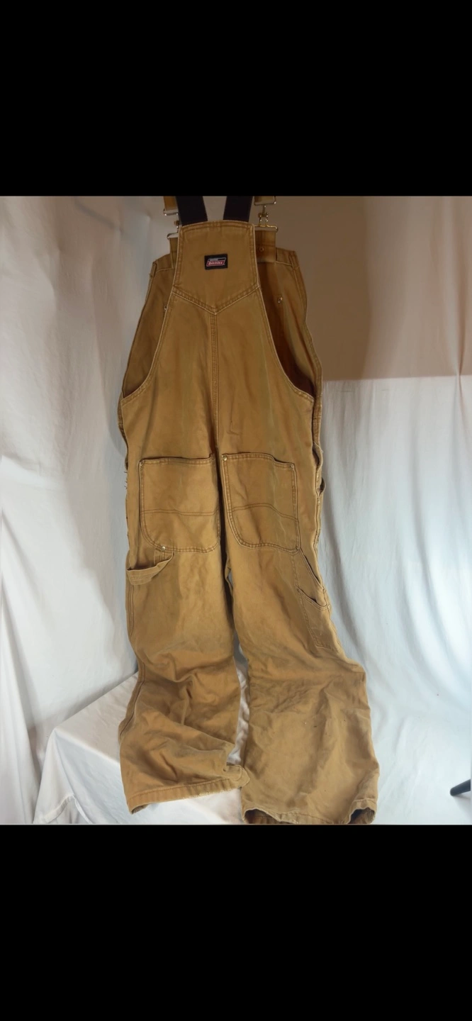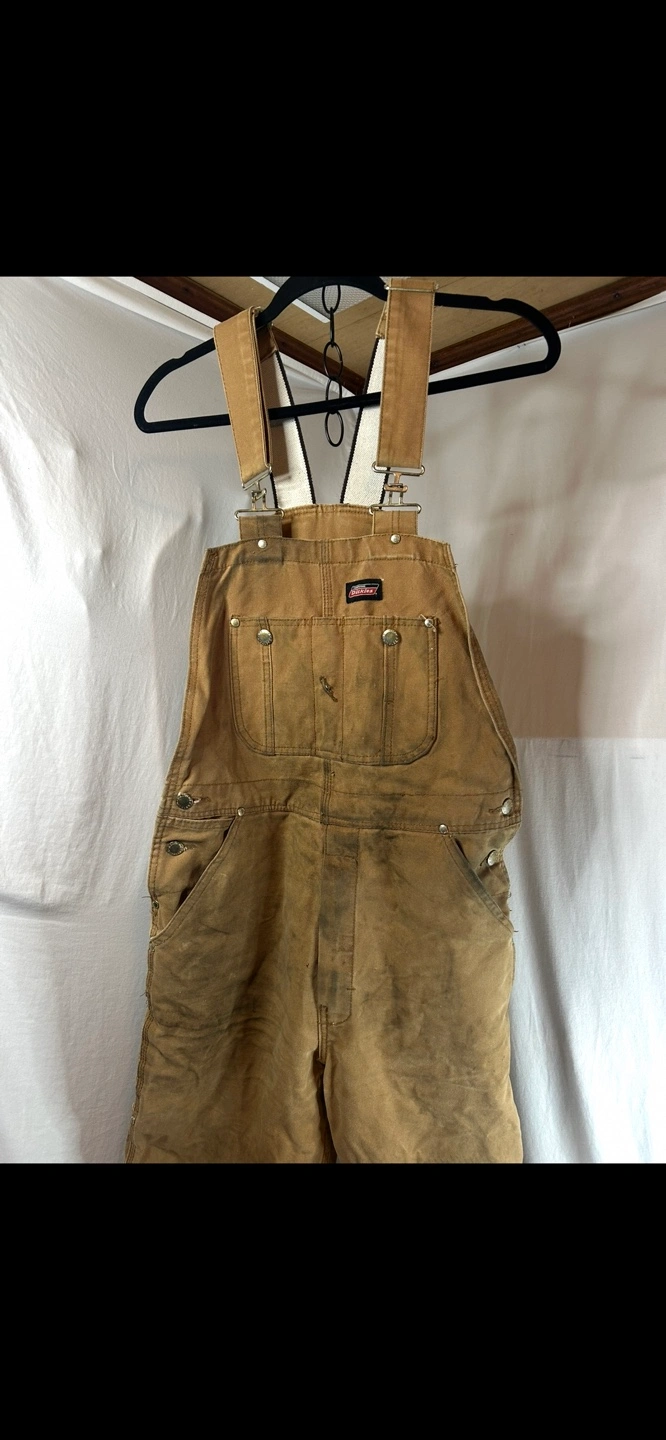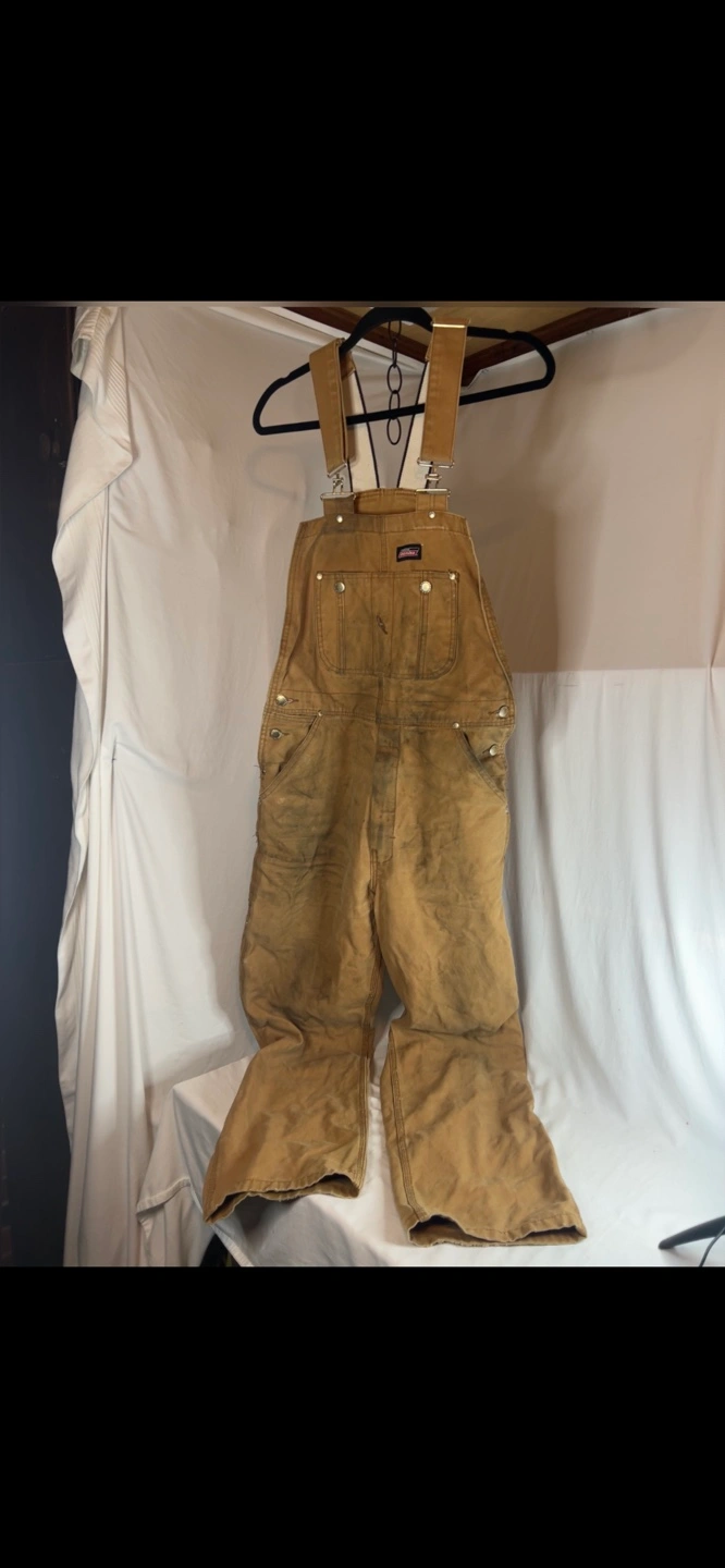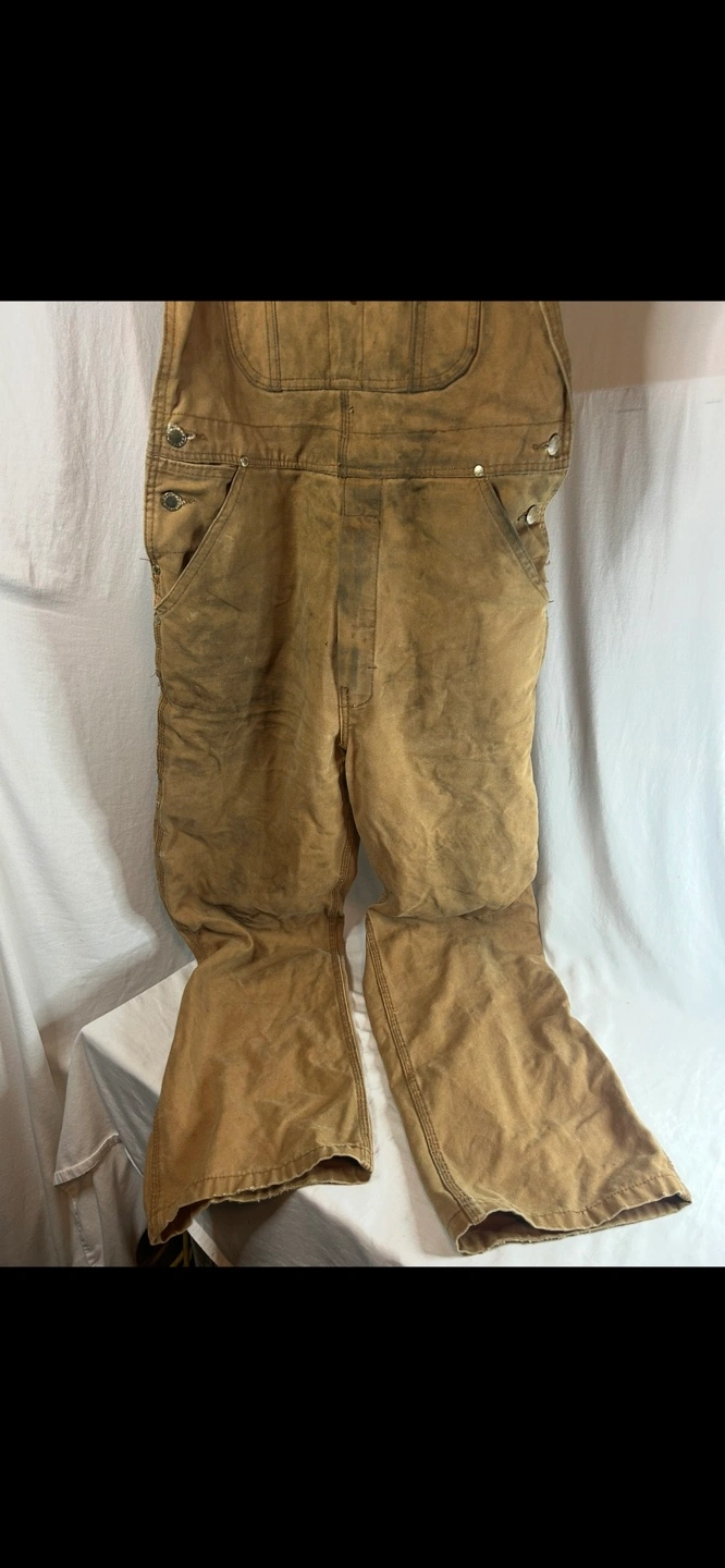 Men's brown canvas bib overalls. Multiple pockets. Durable material. Well-worn.
