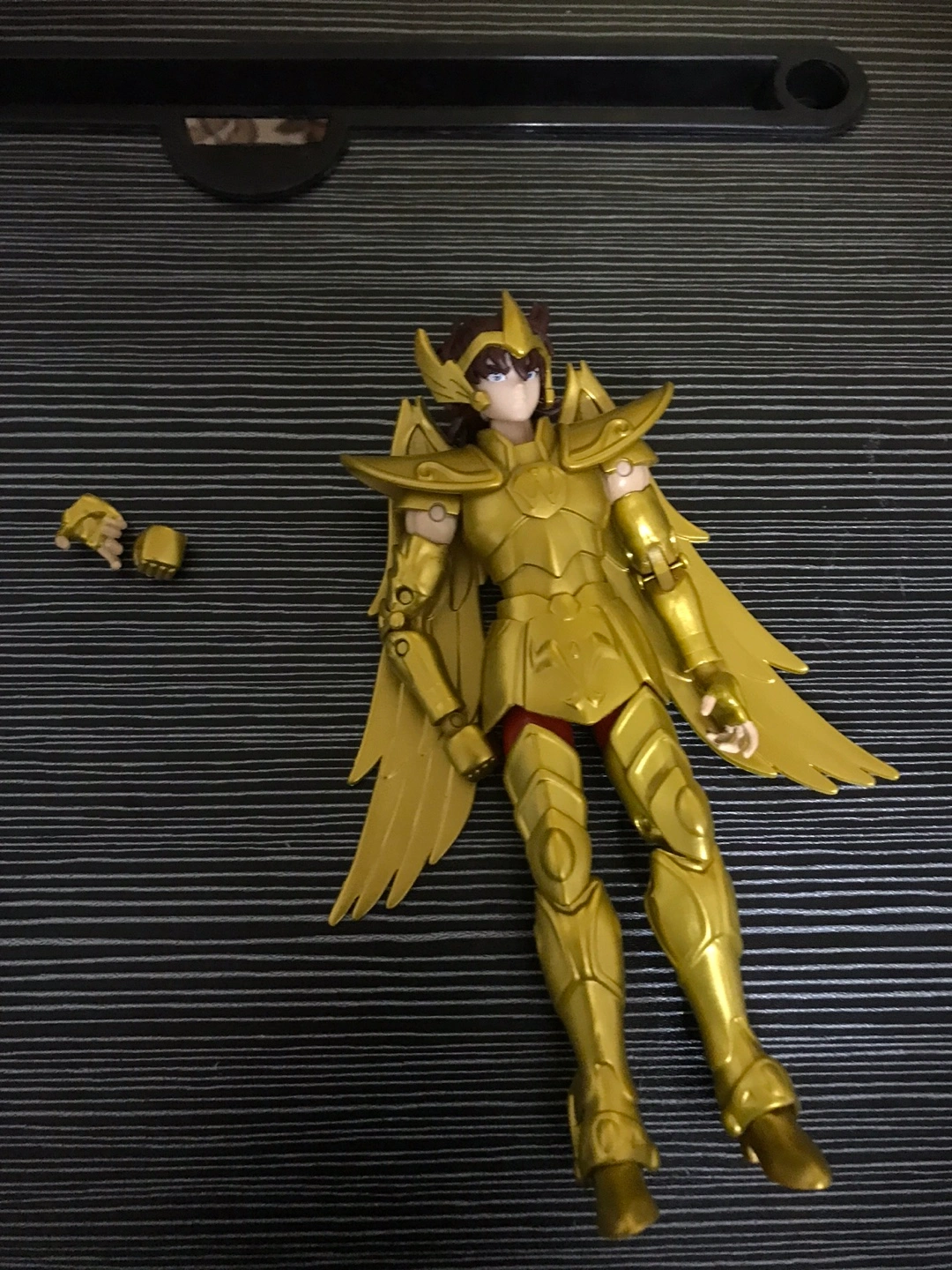 Pre-owned Saint Seiya Myth Cloth Aiolos action figure. Figure is disassembled, some parts are separated. Gold coloured armour. Collectible item.