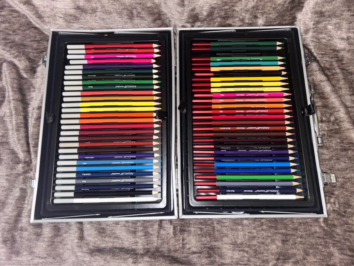 Large aluminium carry case. Contains coloured pencils, pastels, paint tubes, and brushes. Ideal for students or hobbyists.