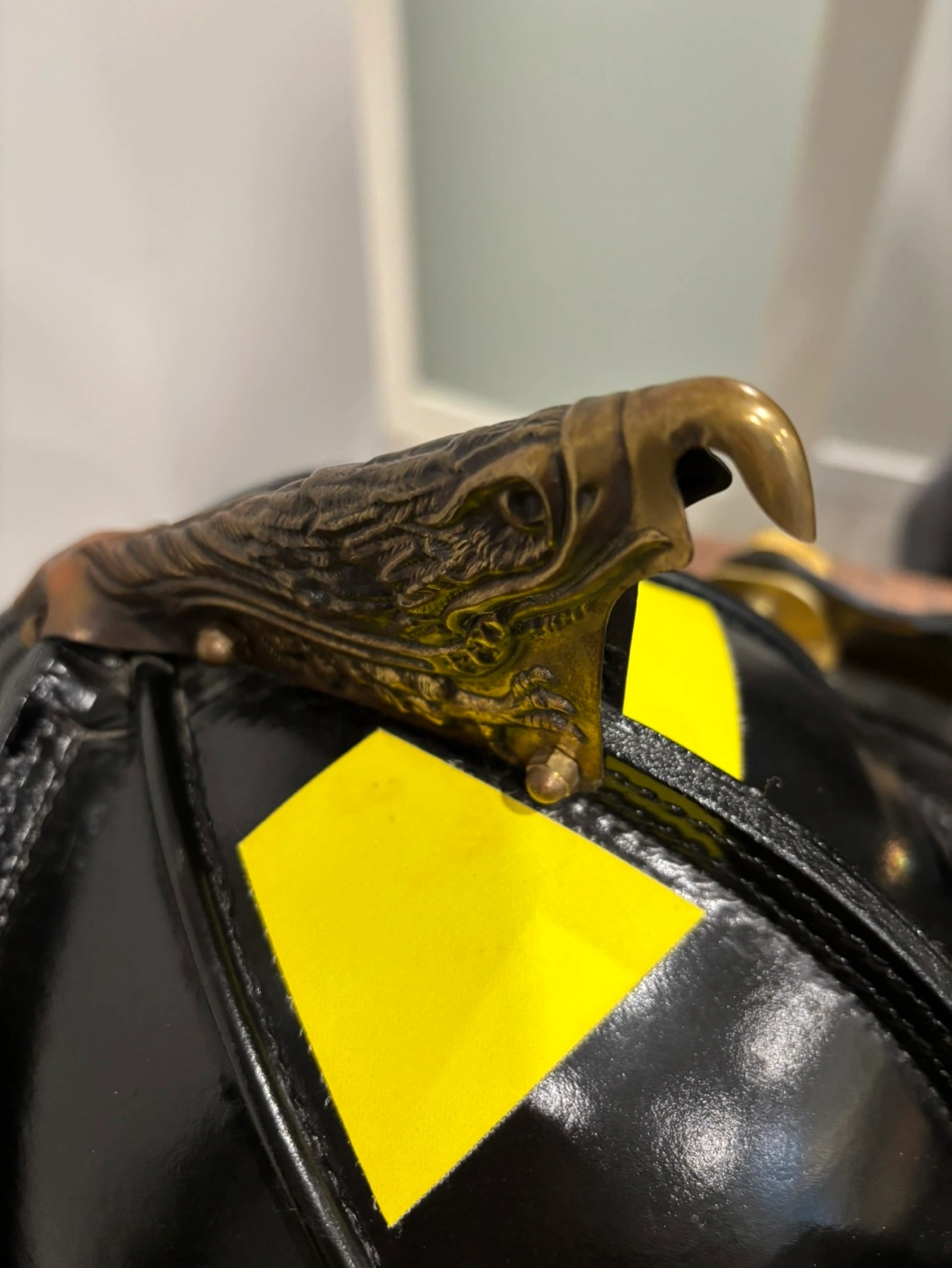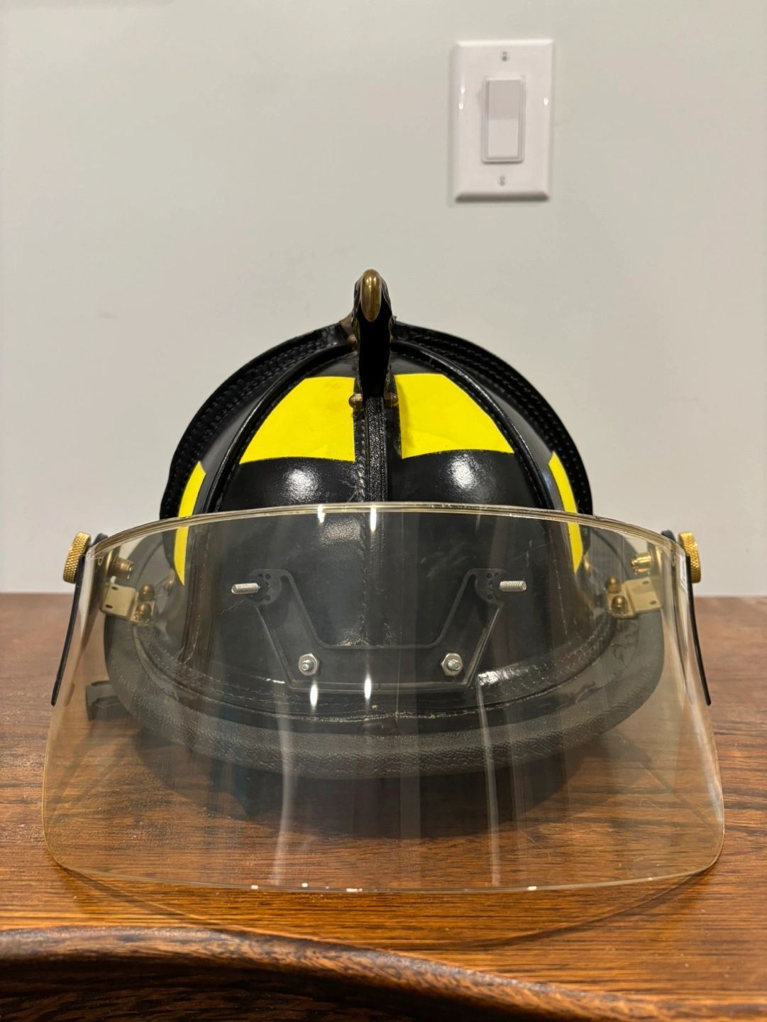 American Heritage fire helmet. Black leather and fibreglass construction. Includes a clear faceshield. Made in the USA by Lion Apparel.
