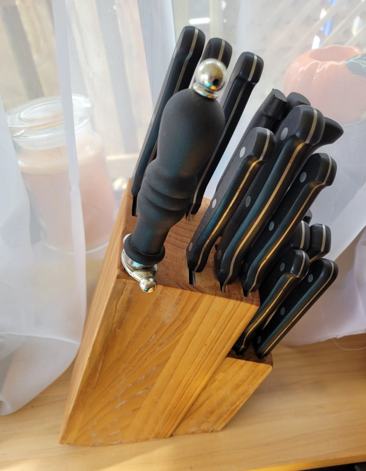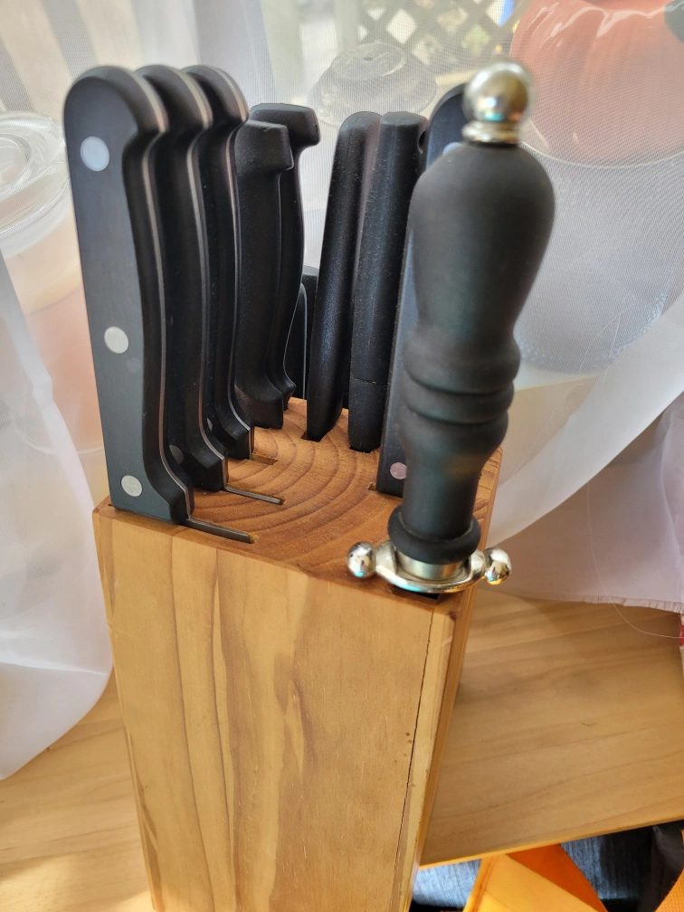 bread, chopping, slicing, santoku and steak knives included.