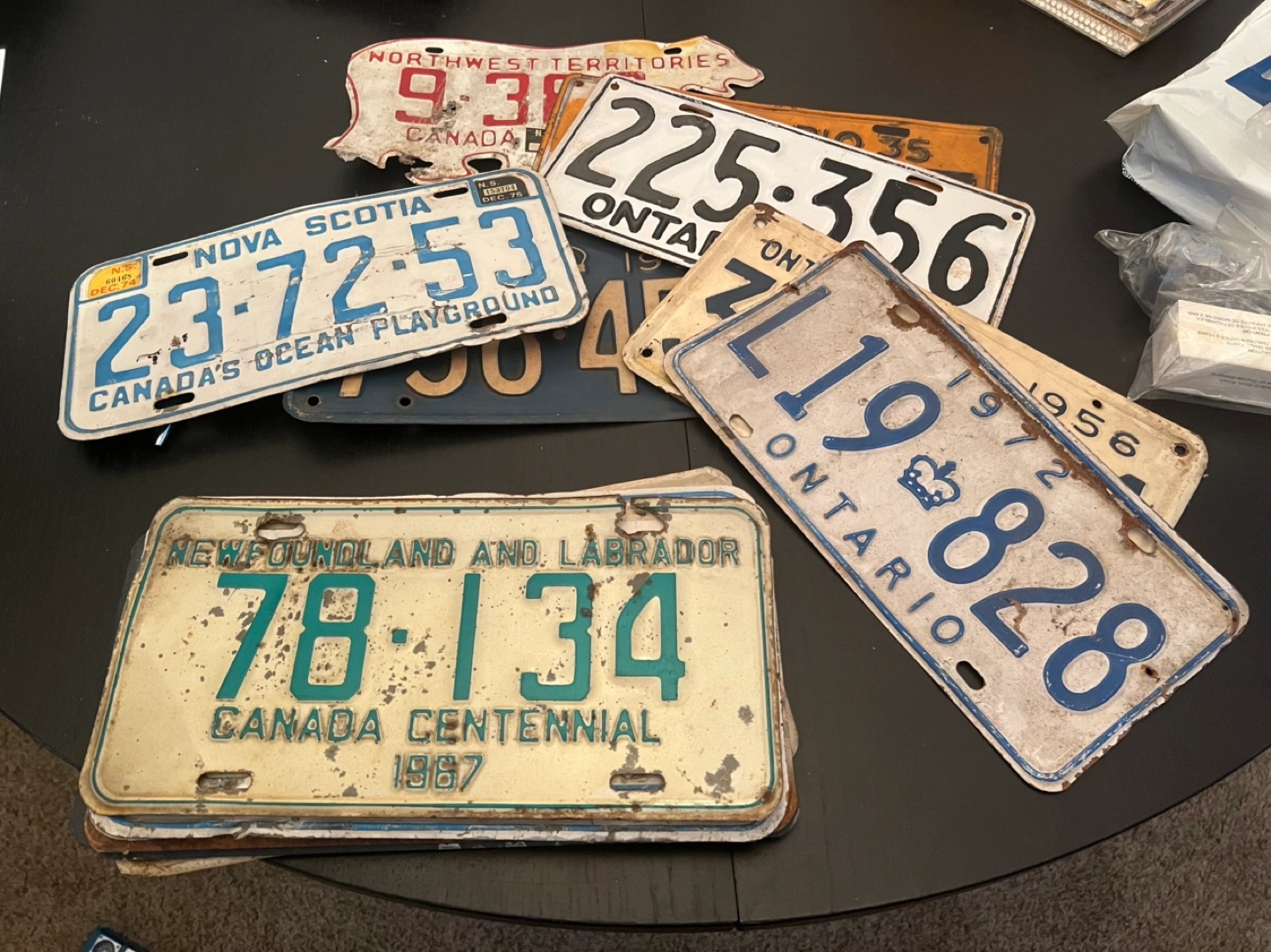 Collection of vintage license plates from various Canadian provinces and territories. Plates show wear consistent with age. Great for collectors or enthusiasts. Includes Ontario, Nova Scotia, Newfoundland and Labrador, and Northwest Territories plates.