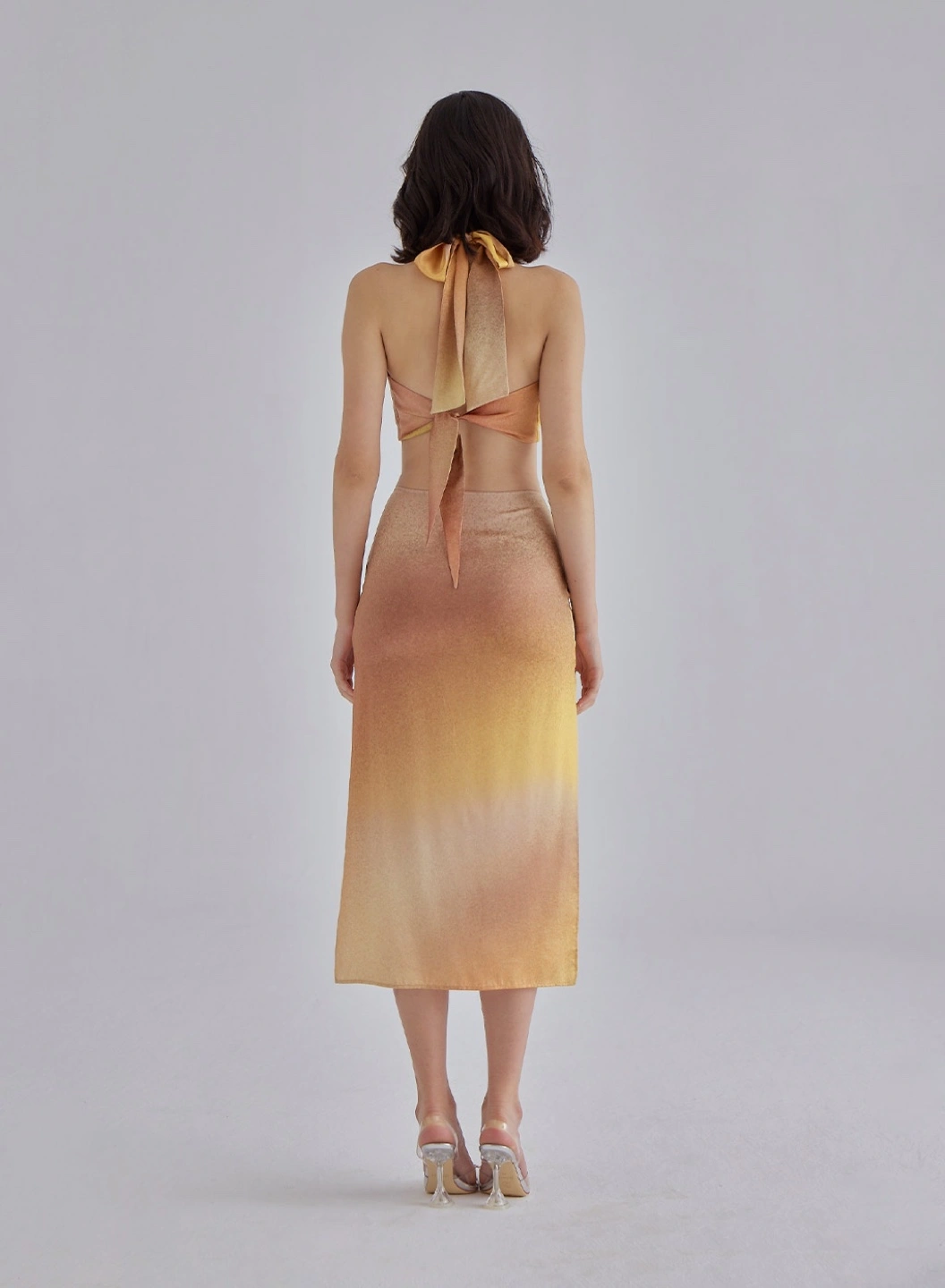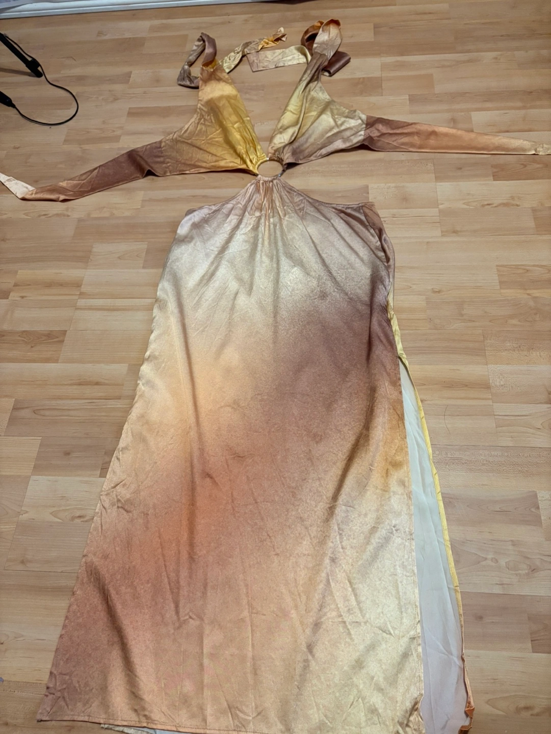 Gorgeous midi dress. Features a gold gradient design, cut-out detail, halterneck, and side slits. Small untreated mark near slit. Mulberry silk and spandex, hand wash. Retail is approx $259 CAD. Pick up only.