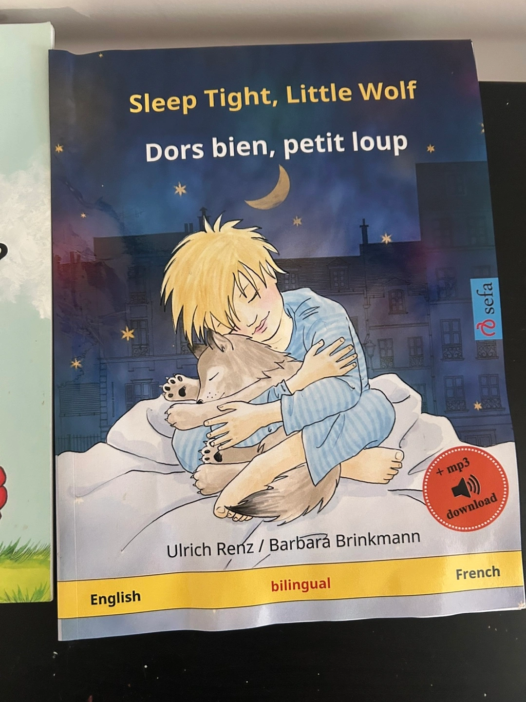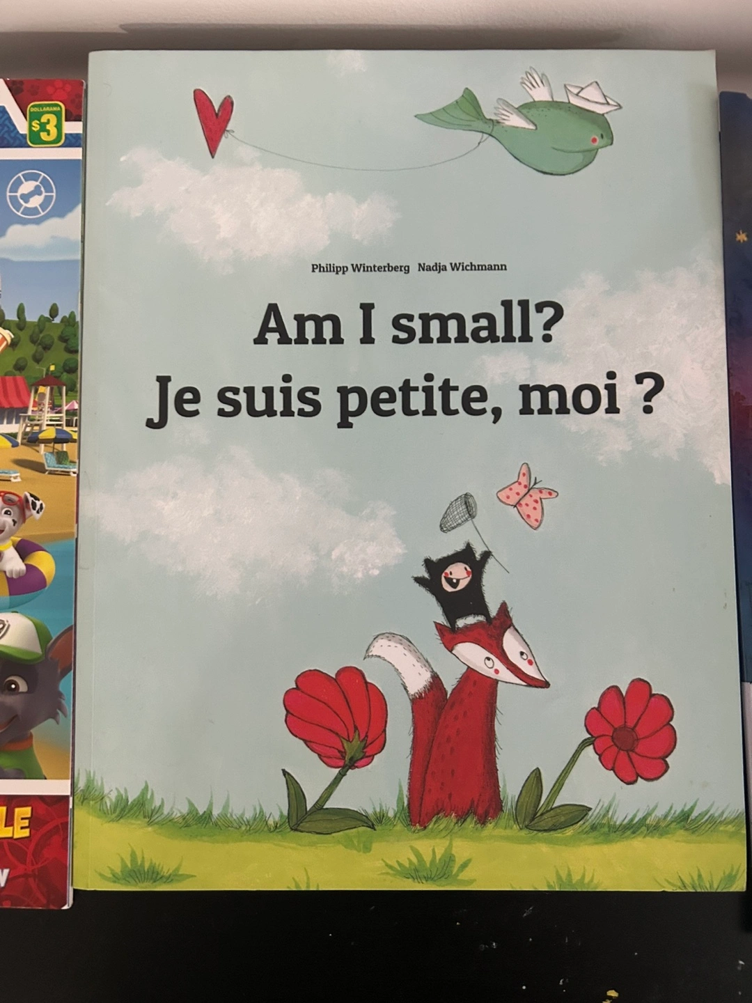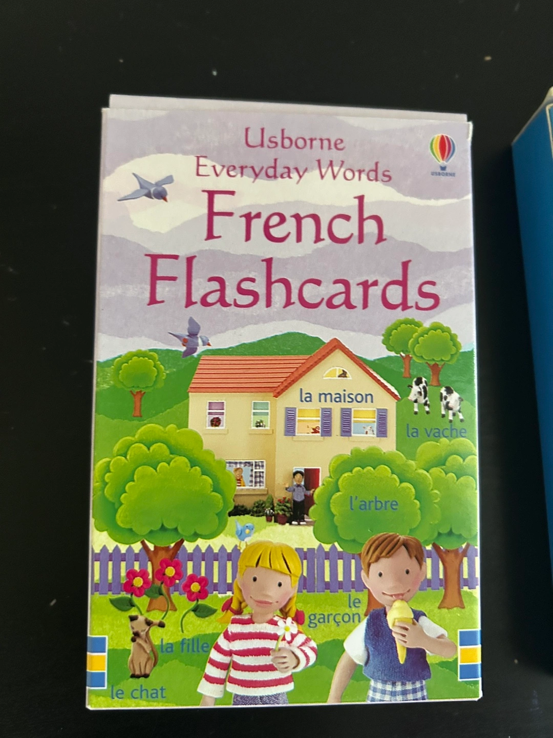 Bundle includes Usborne Everyday Words French flashcards, Berlitz Kids French flashcards, Paw Patrol bilingual book, Sleep Tight Little Wolf bilingual book, and Am I Small? bilingual book. Great for young learners. Used but in good condition.