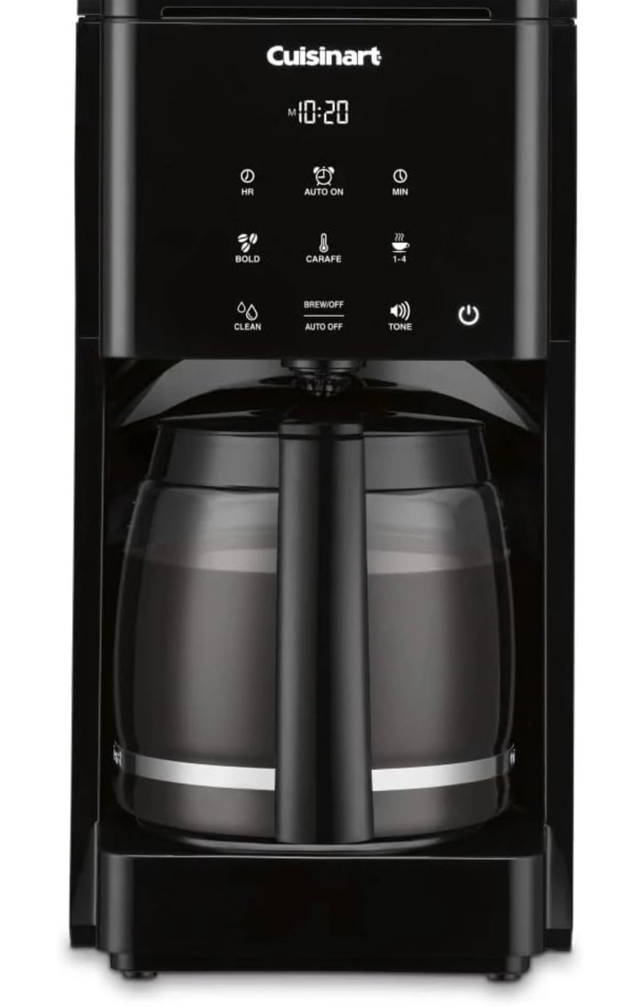 Black programmable coffee maker. 14-cup capacity. Features include auto-on, bold brew, carafe, and tone settings. Programmable timer. Glass carafe.