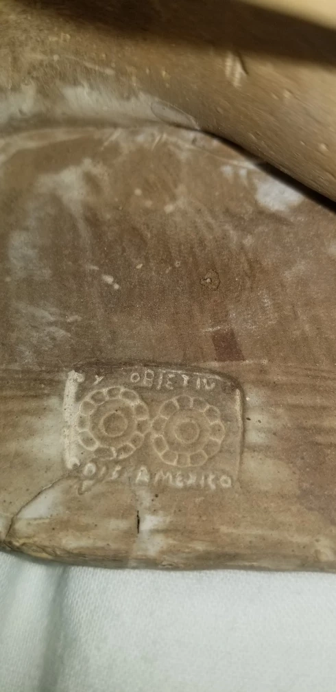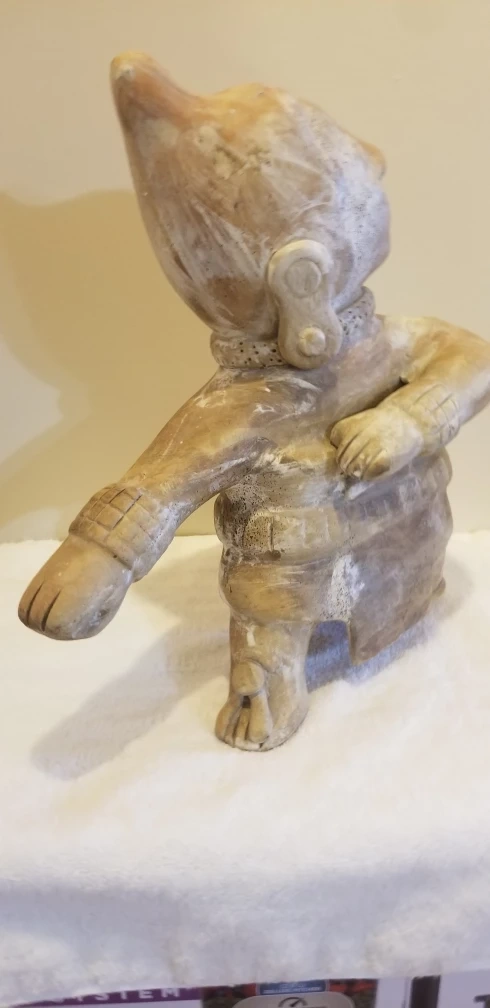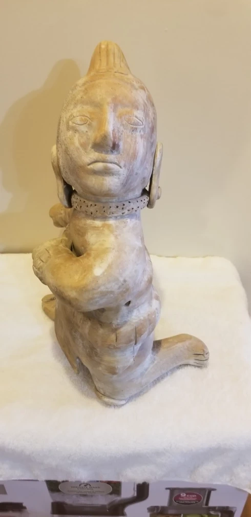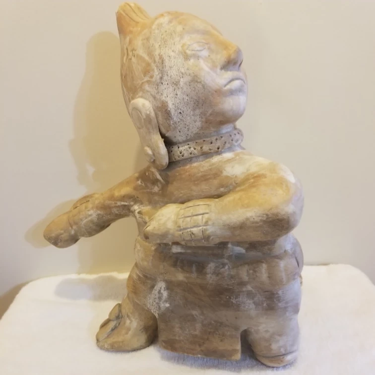 The object is a Jaina - style Mayan figurine made of terracotta clay.