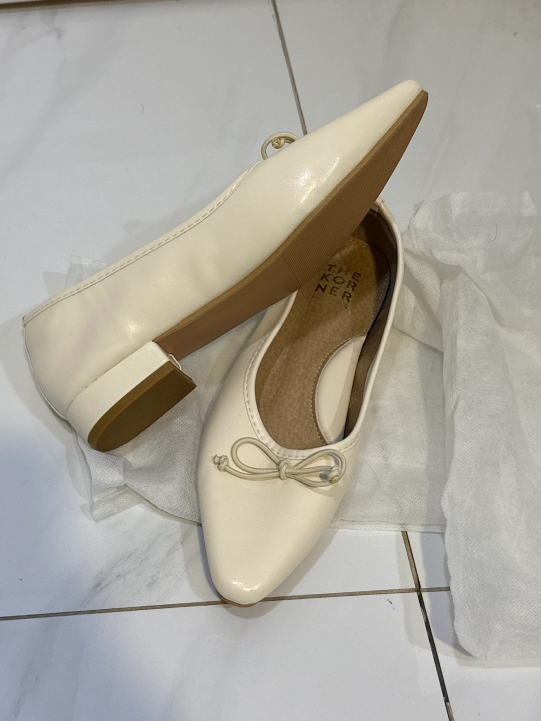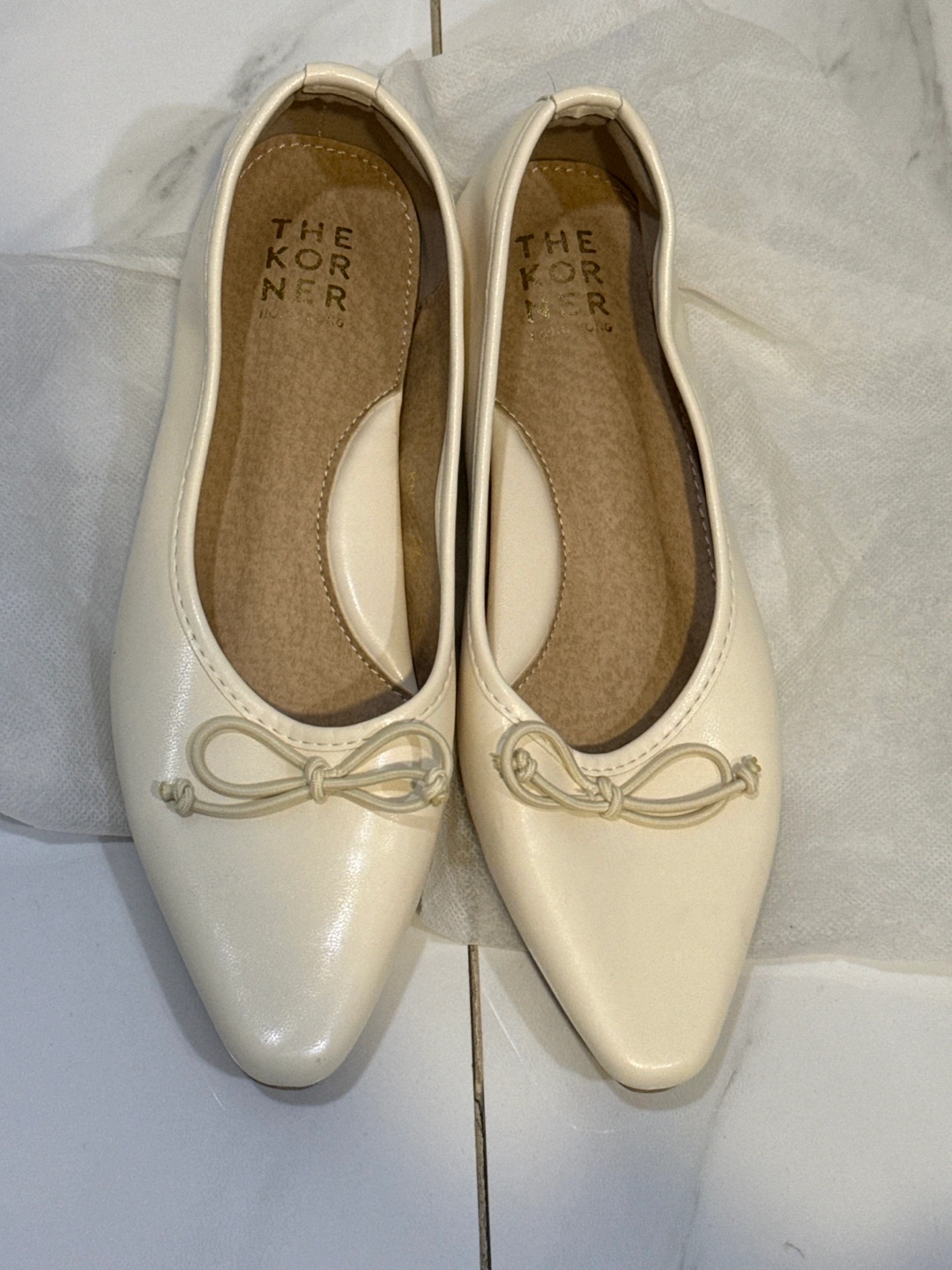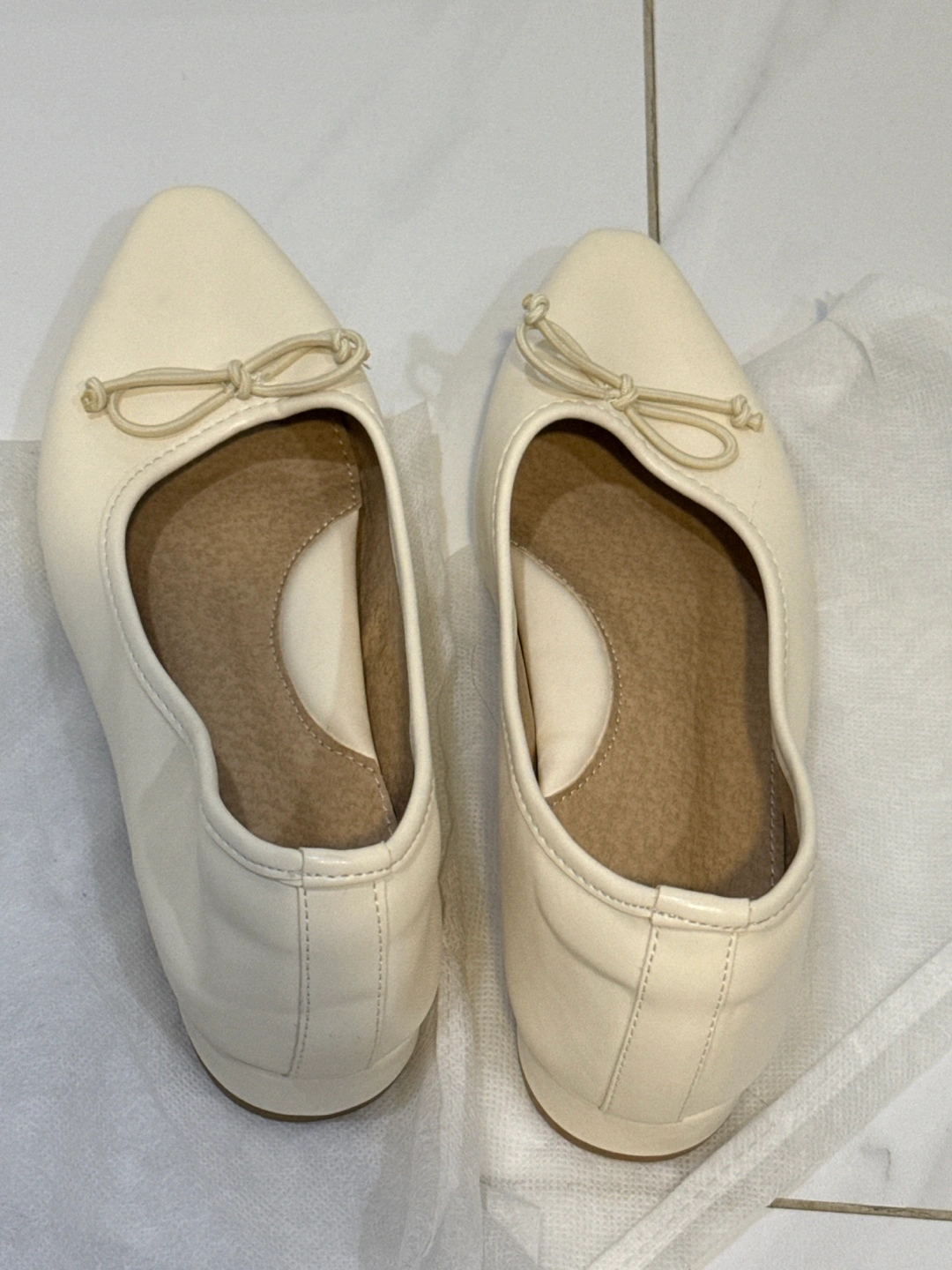 Pair of off-white women's flats. Pointed toes and small bows on the vamp. Low heel. Minimalist design. Appear to be made of faux leather.
