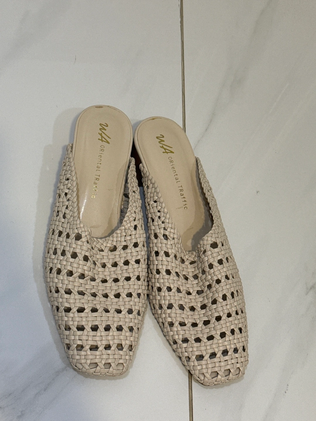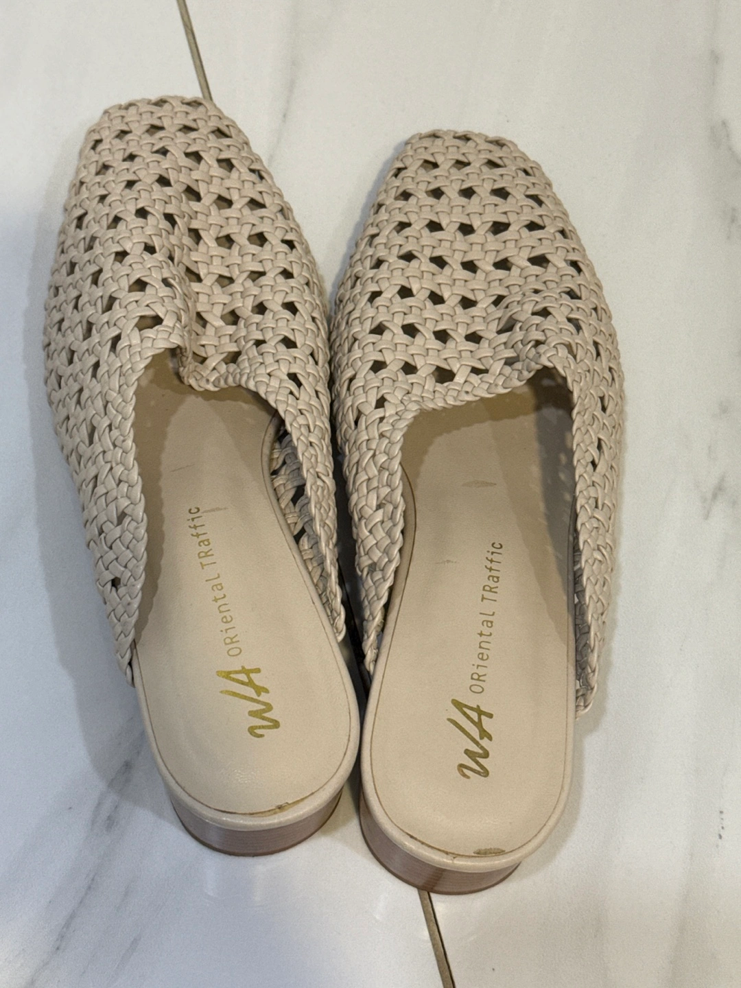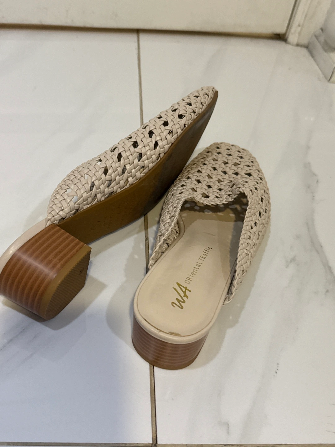 Cream-coloured woven mules. Low block heel. Open toe and back.