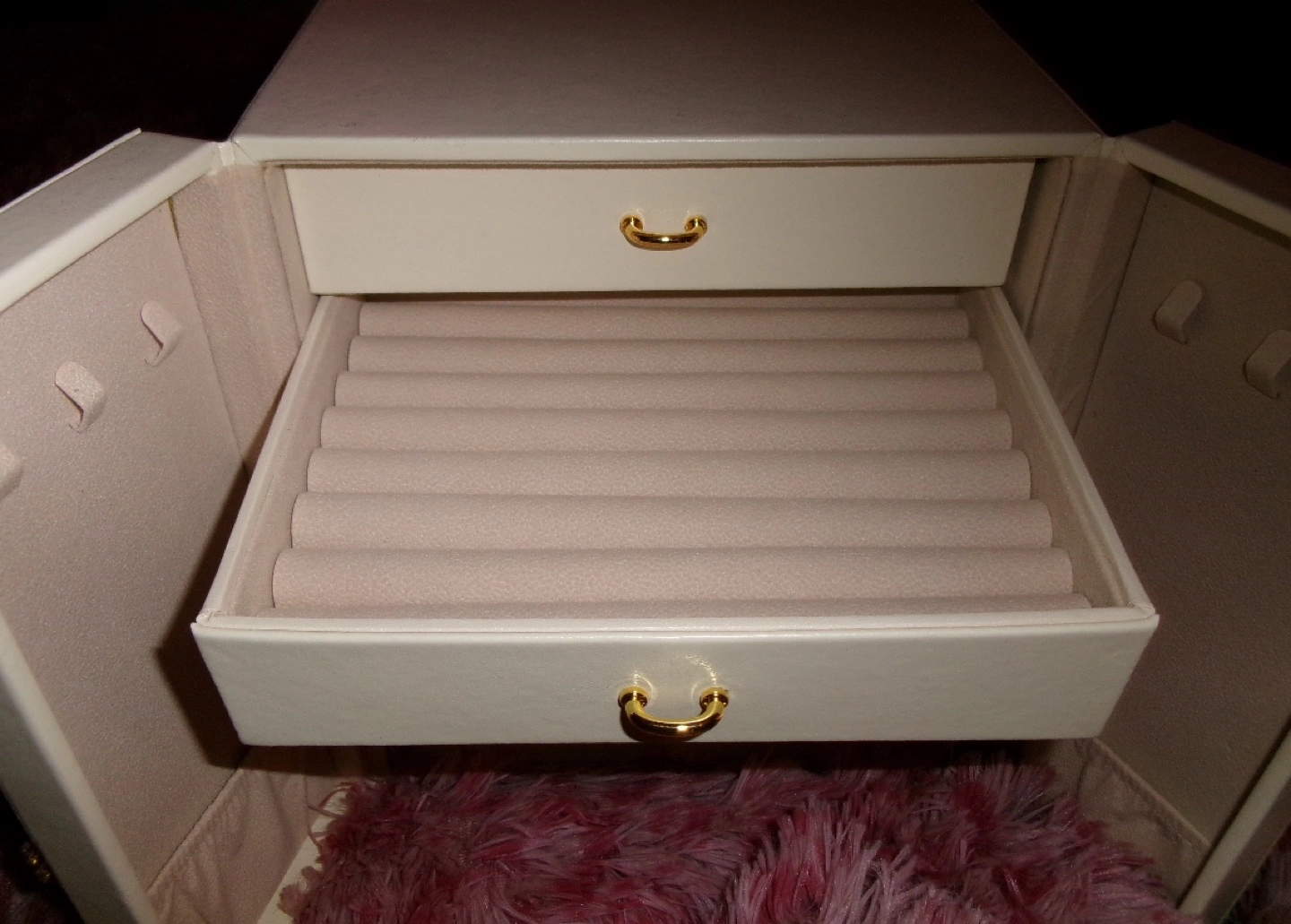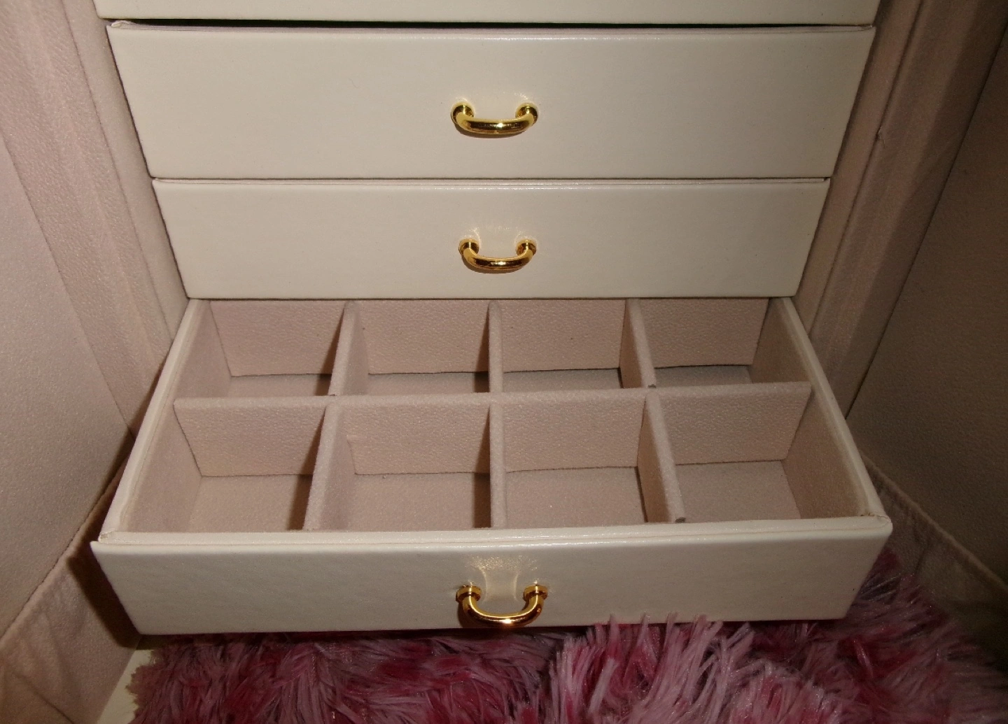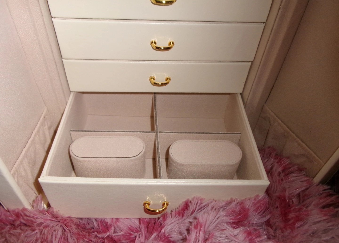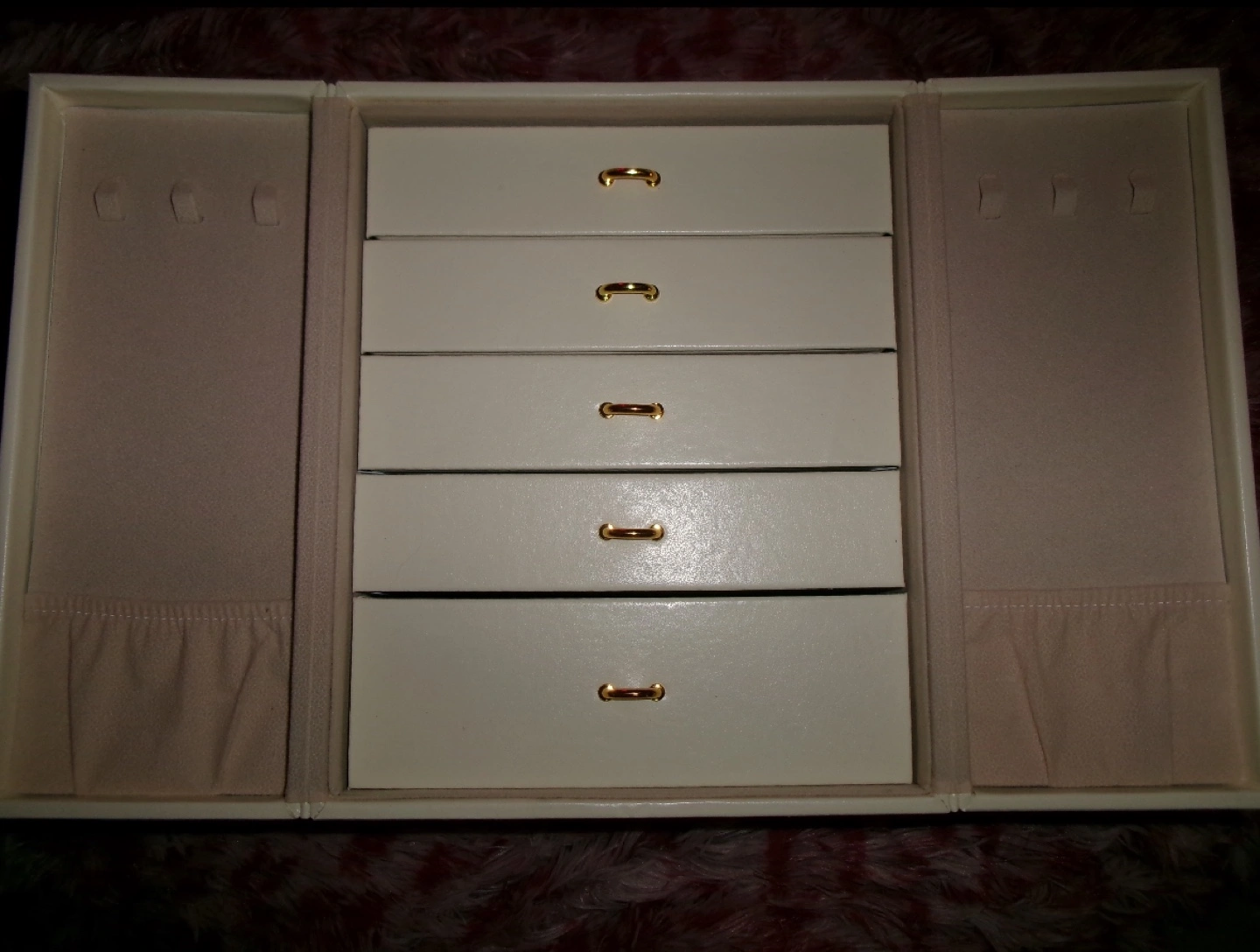 Elegant off-white jewellery box. Features multiple drawers and compartments. Gold-toned hardware. Ideal for storing necklaces, earrings, rings, and bracelets. Compact design, perfect for any vanity. 5 drawers plus doors to hang necklaces