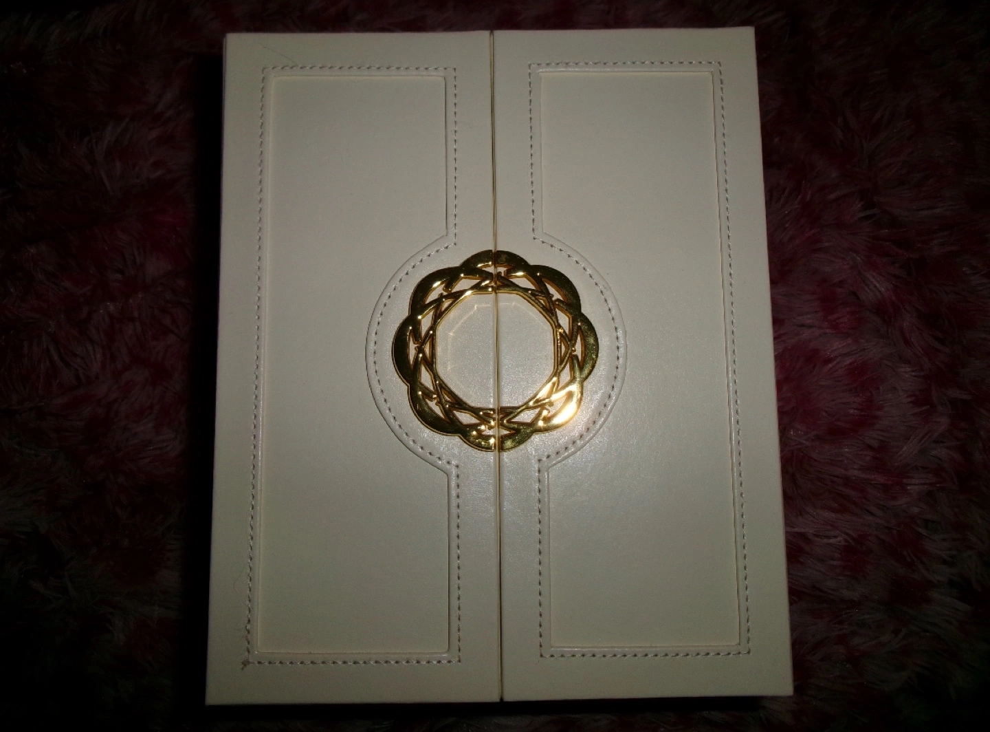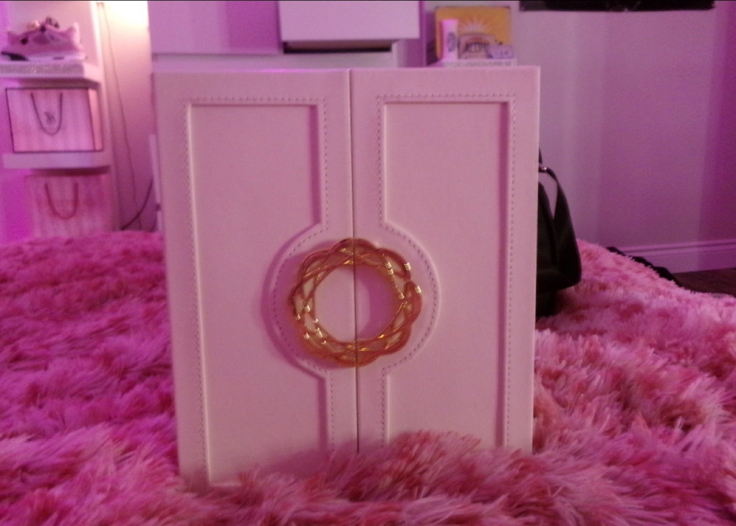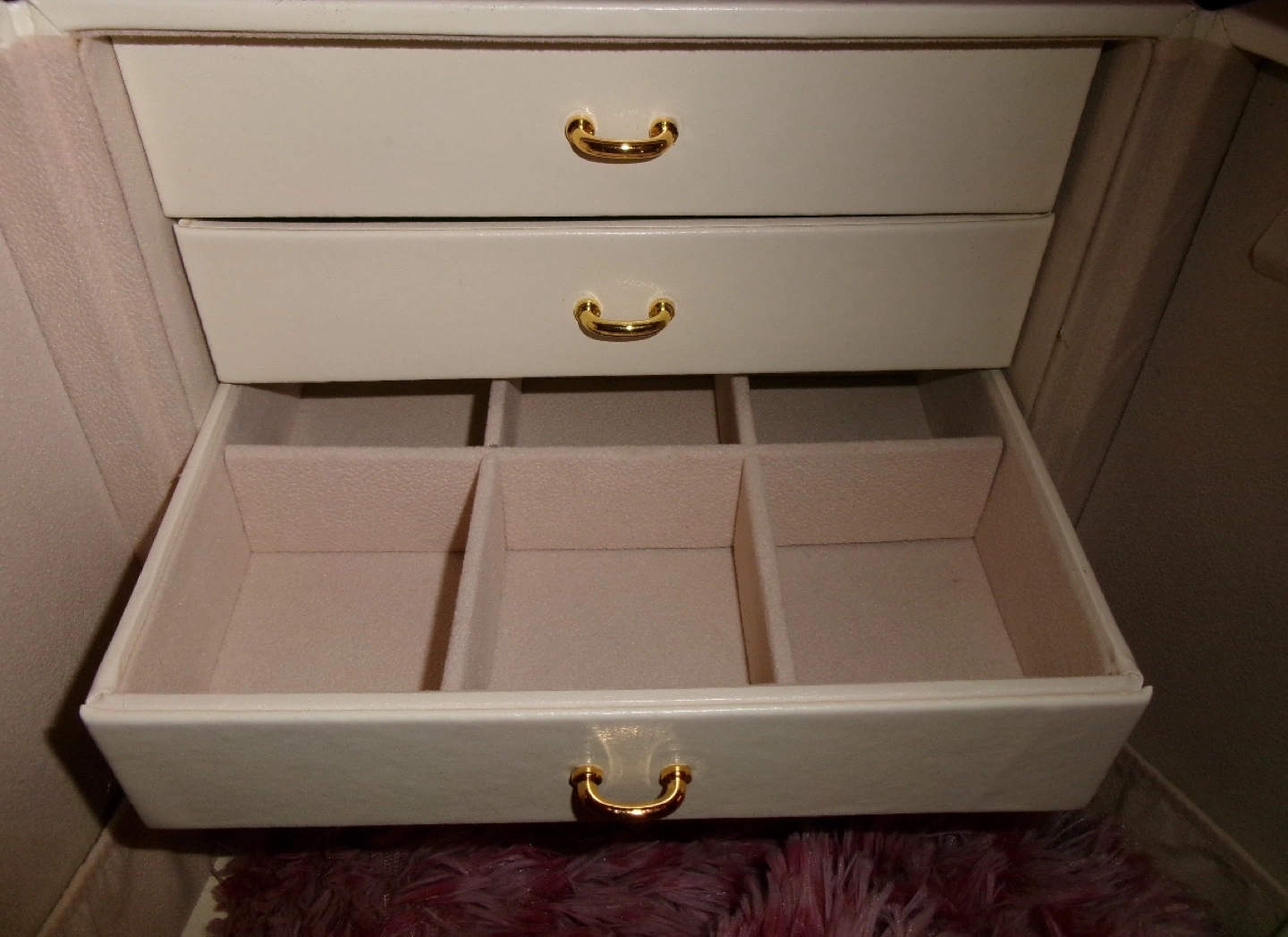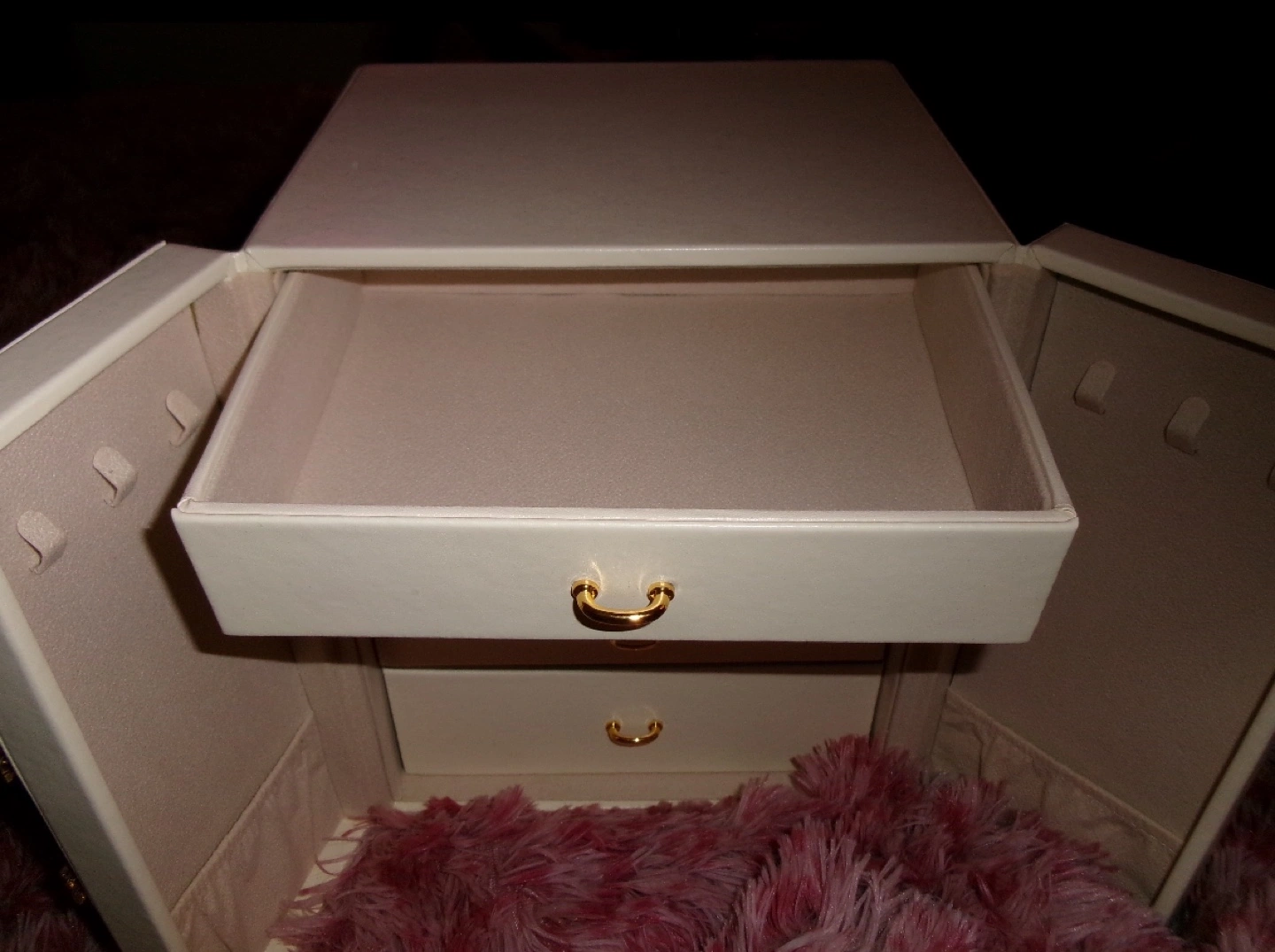 Elegant off-white jewellery box. Features multiple drawers and compartments. Gold-toned hardware. Ideal for storing necklaces, earrings, rings, and bracelets. Compact design, perfect for any vanity. 5 drawers plus doors to hang necklaces