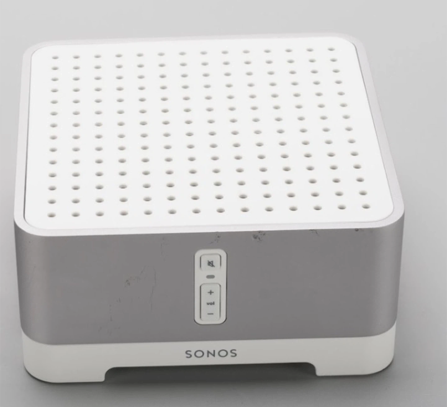 This Sonos Connect:Amp is a versatile audio device. It has volume and mute controls on the front. Silver and white colourway. Comes with power cable only. Barely used. Works with updated app no problem.