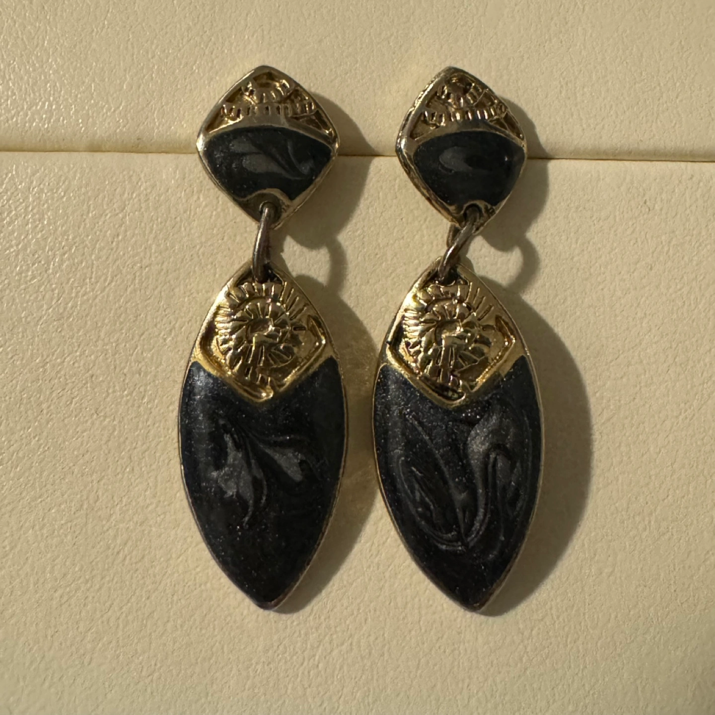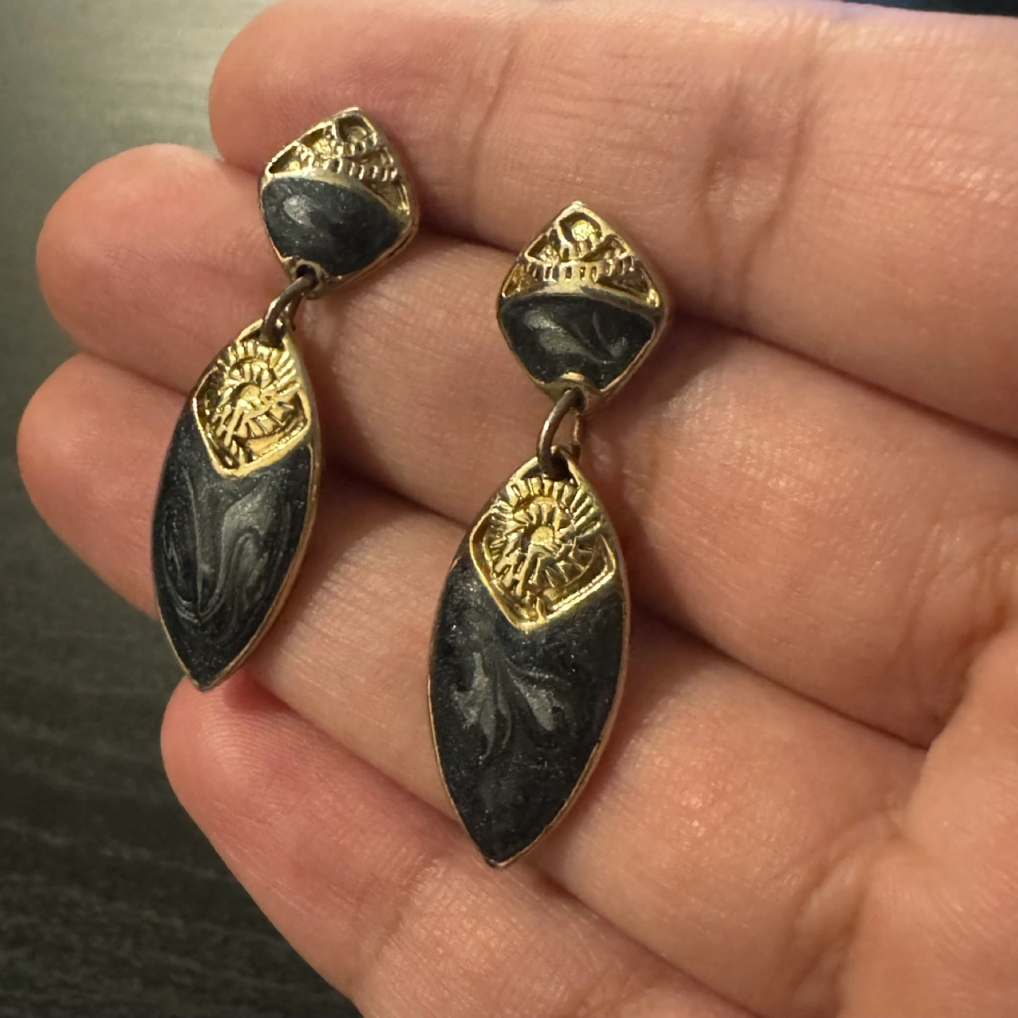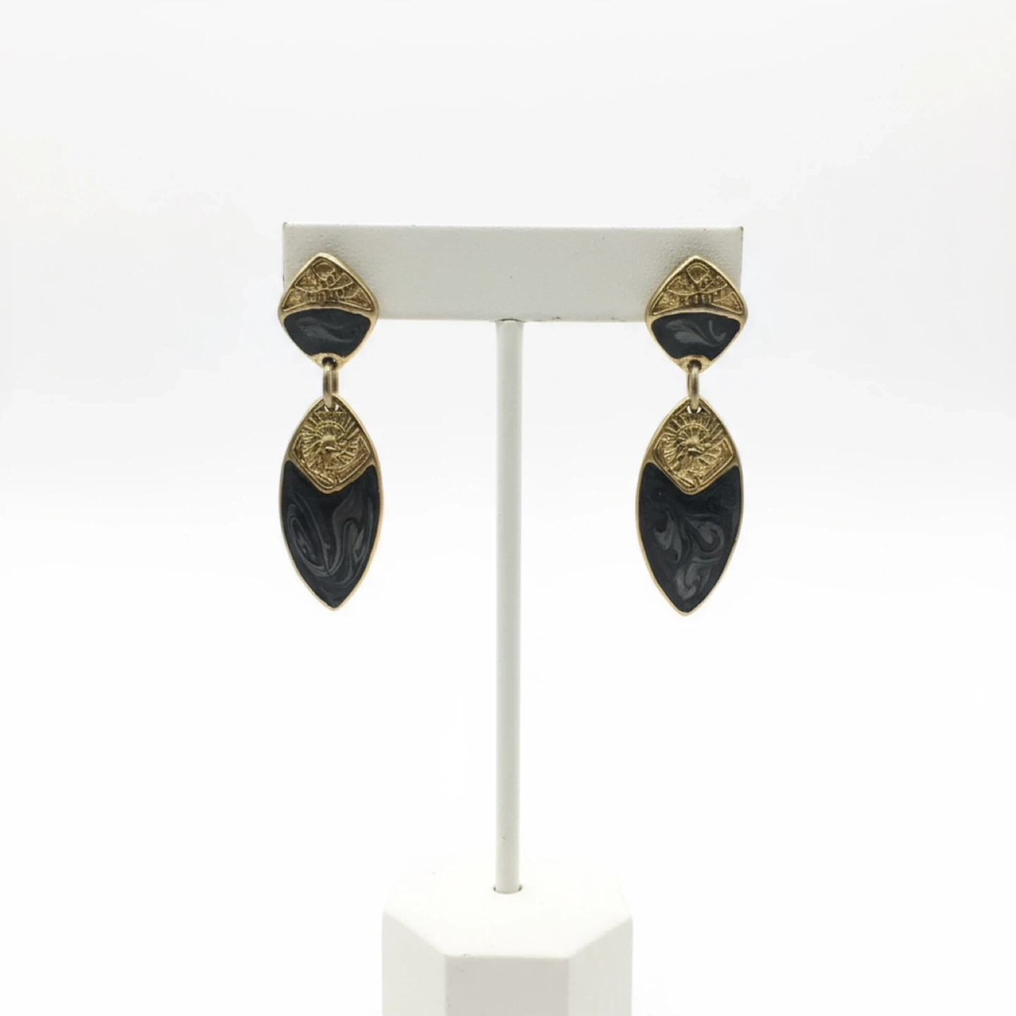 Beautiful pair of vintage earrings. Gold tone metal with gray-black marbled accents. Two-tiered design. Elegant and unique.