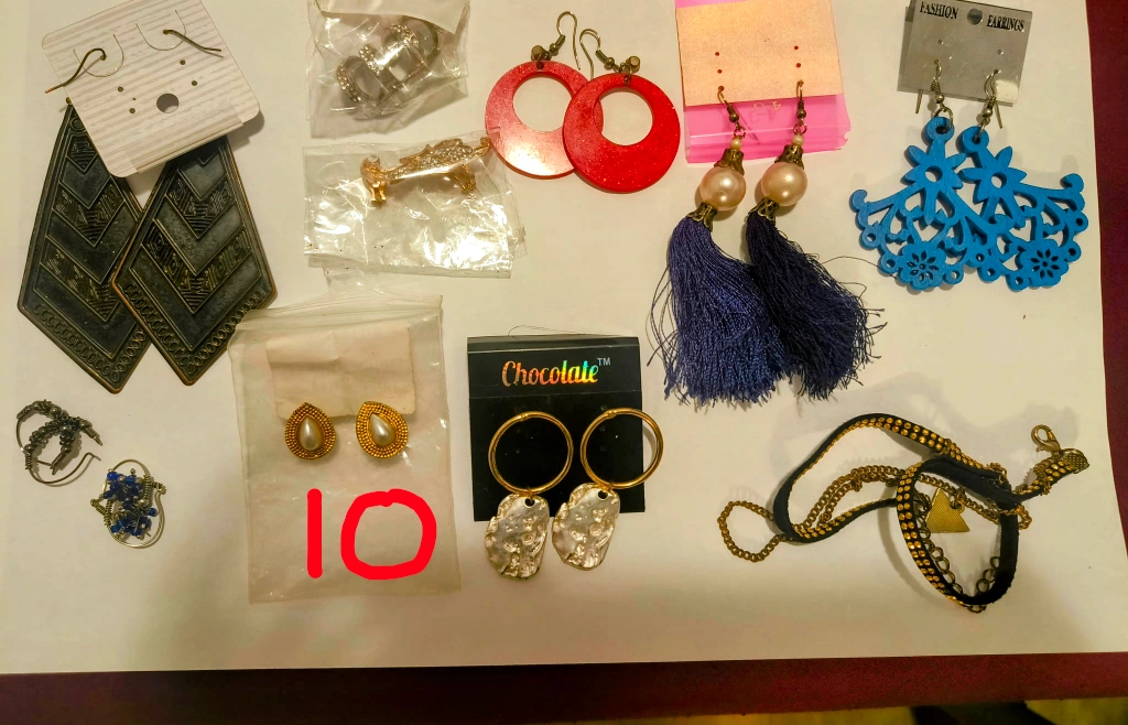 Large lot of various earrings and a necklace. Includes different styles and colours. Some earrings are gold, others are red, blue, and dark grey. One pair of earrings are marked Chocolate™. Necklace features a black band and gold chains.
