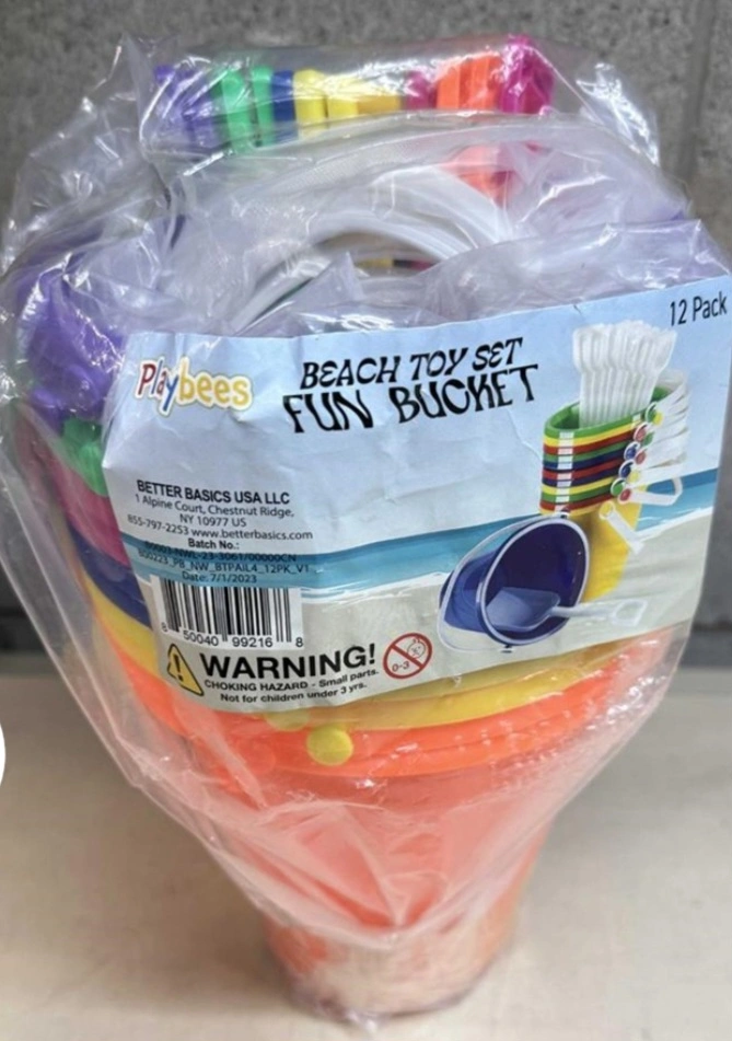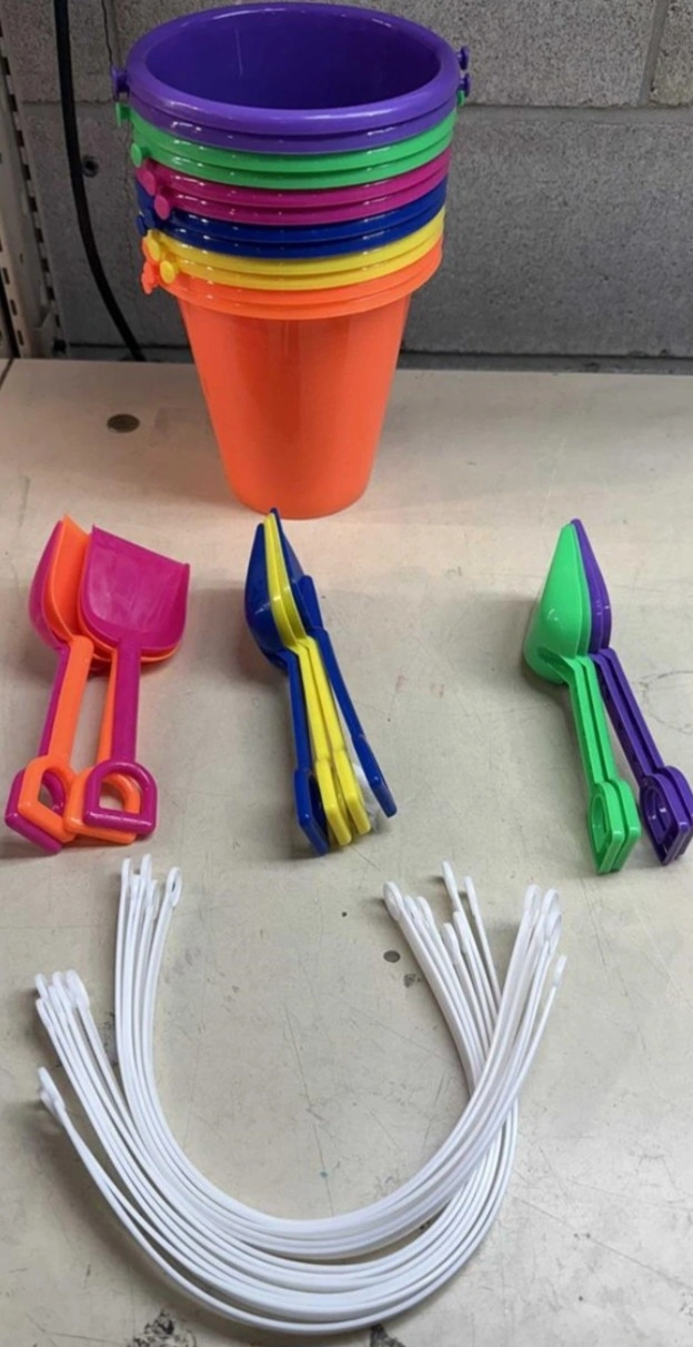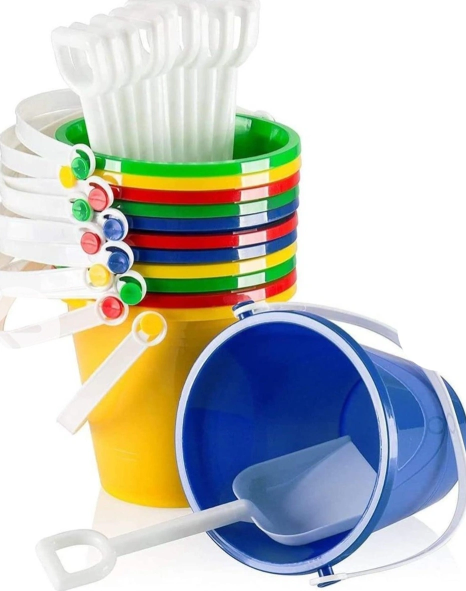 Colorful plastic beach buckets and shovels. Great for sandcastles! Includes twelve buckets and shovels. Perfect for kids.