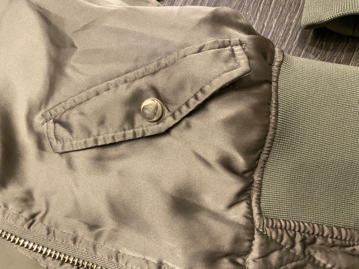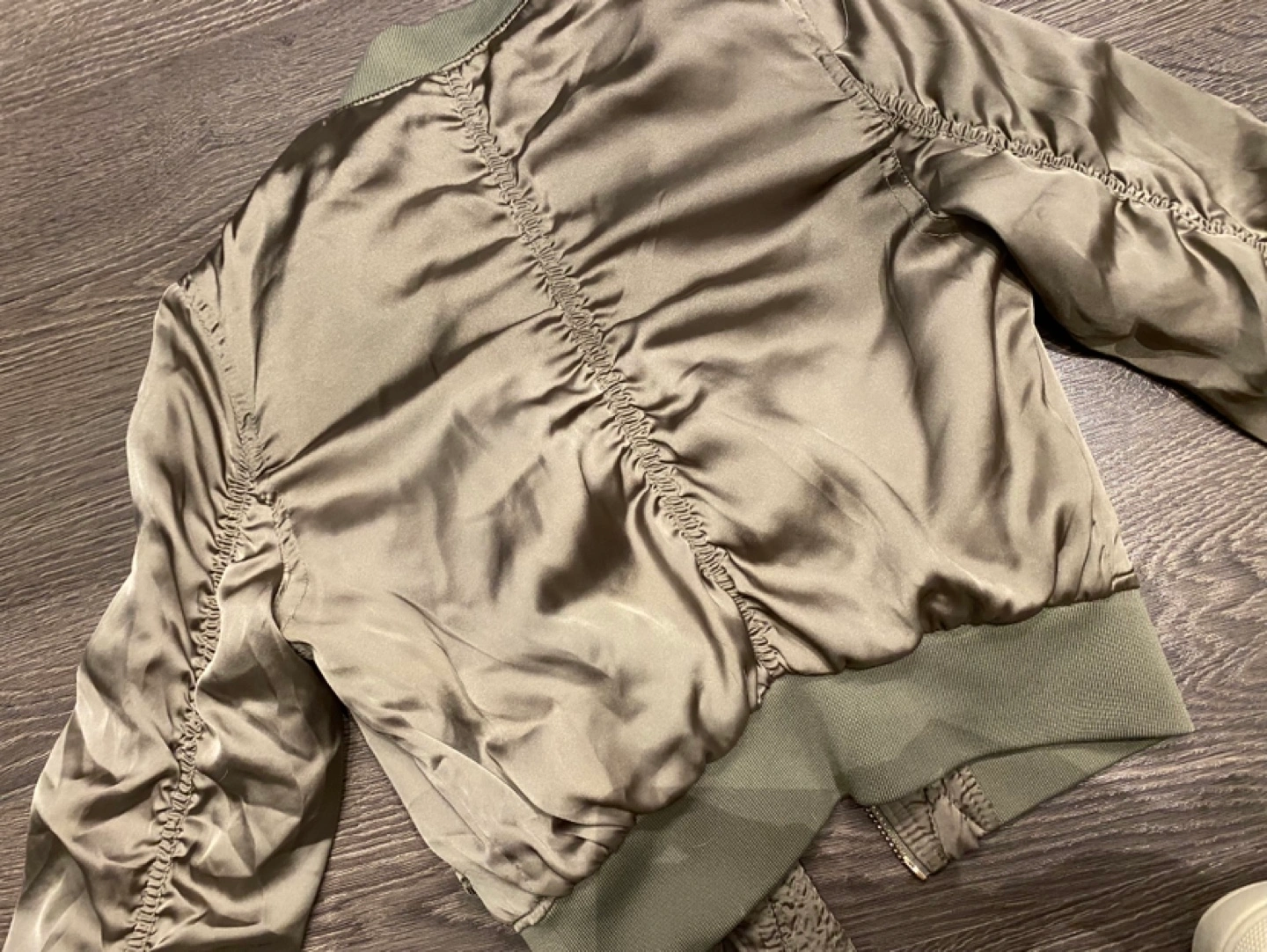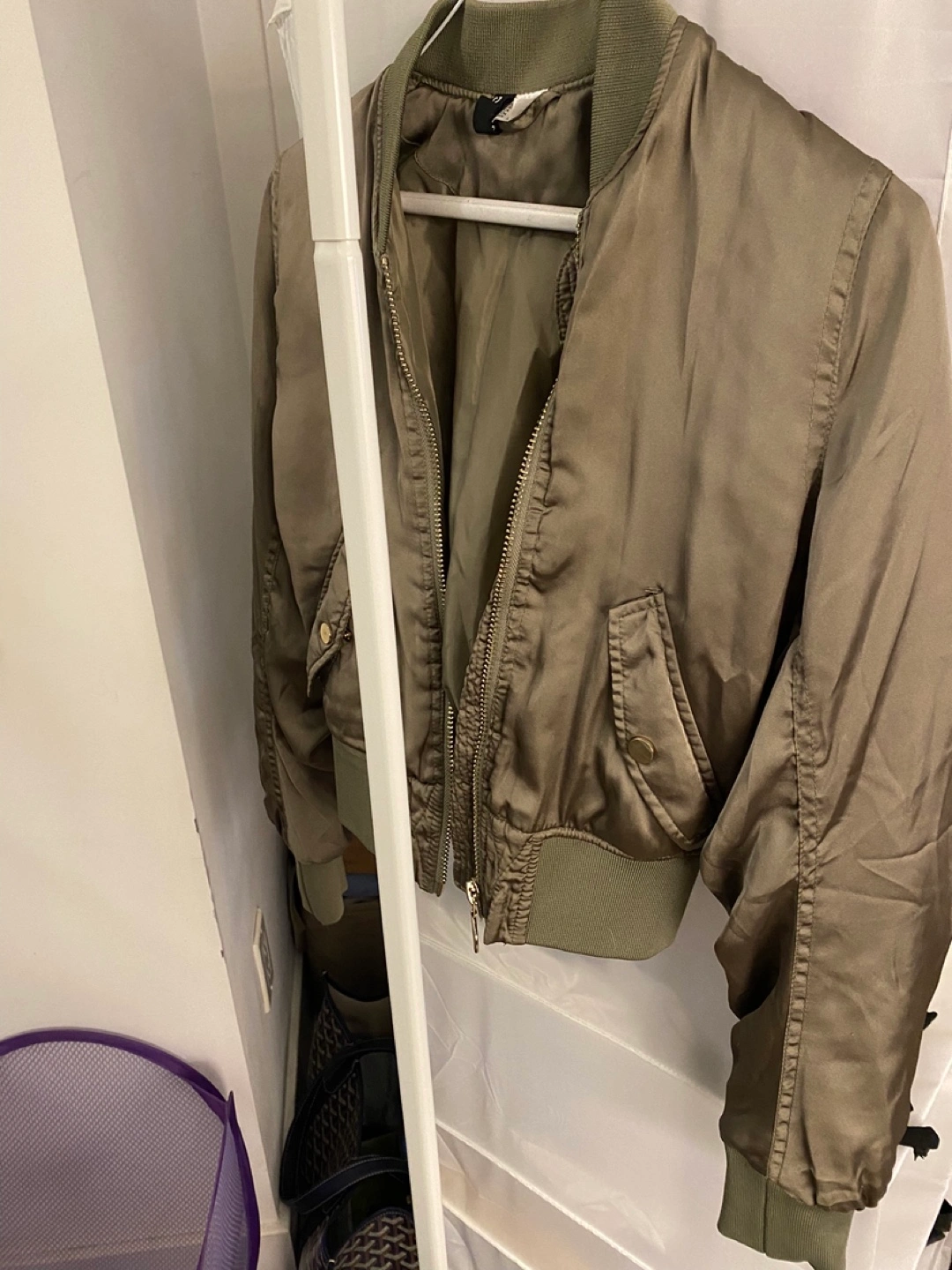 Features a satin-like material, zip closure, and ribbed cuffs in an Olive green colour. Good for layering as well.