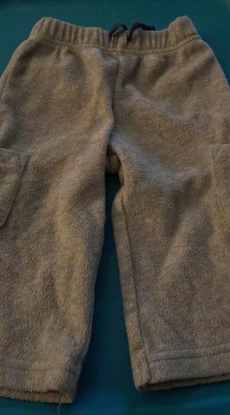 Grey fleece cargo pants. Size 9 months. Elastic waistband with drawstring. Two cargo pockets. No delivery, holds, or refunds. Price is firm.