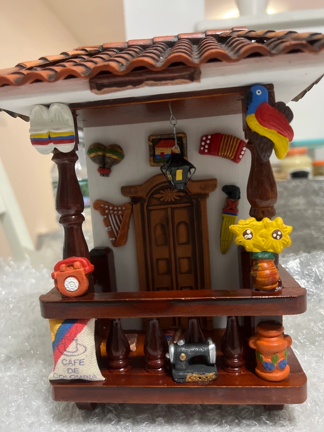 Handcrafted miniature house figurine. Features detailed design, balcony, and various small decorations. Perfect for collectors or home decor.
