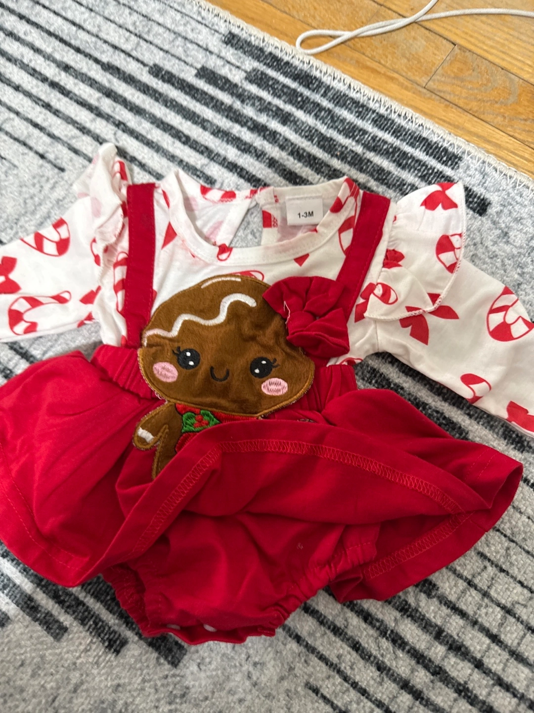 Red and white Christmas outfit. Features a gingerbread man applique. Long sleeves and a red romper. Size 1-3 months.