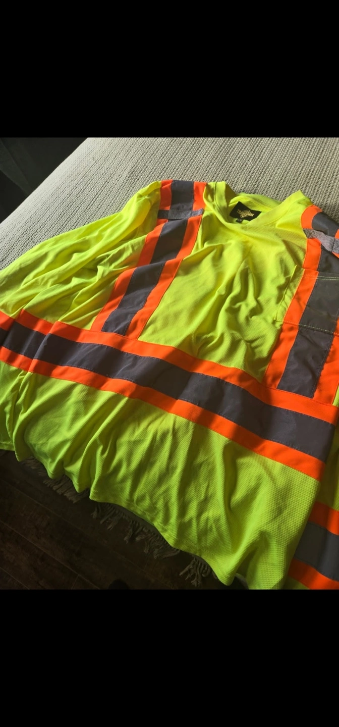 Lime green long-sleeve shirt. Features reflective orange and grey stripes. One chest pocket. Good for work or safety.