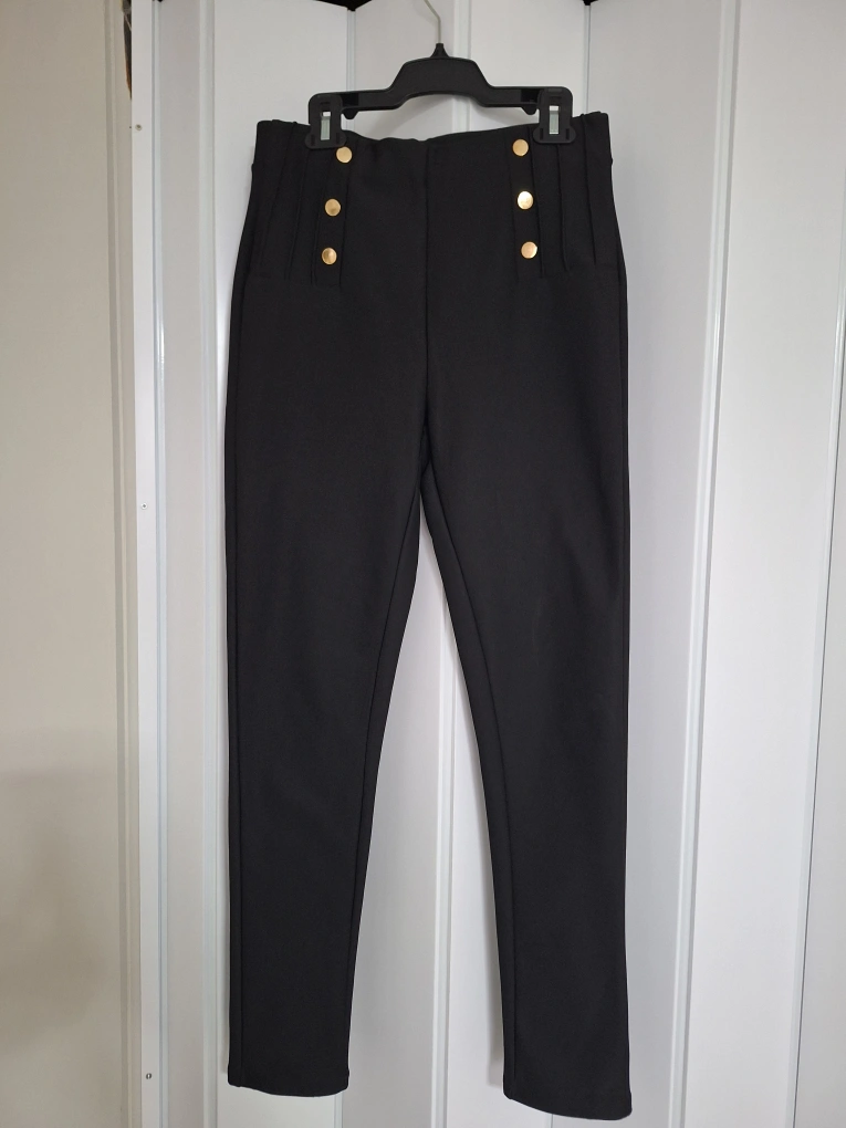 Women's black pants. Features gold buttons on the sides. Slim-fitting. Excellent for a variety of occasions.Insulatet.