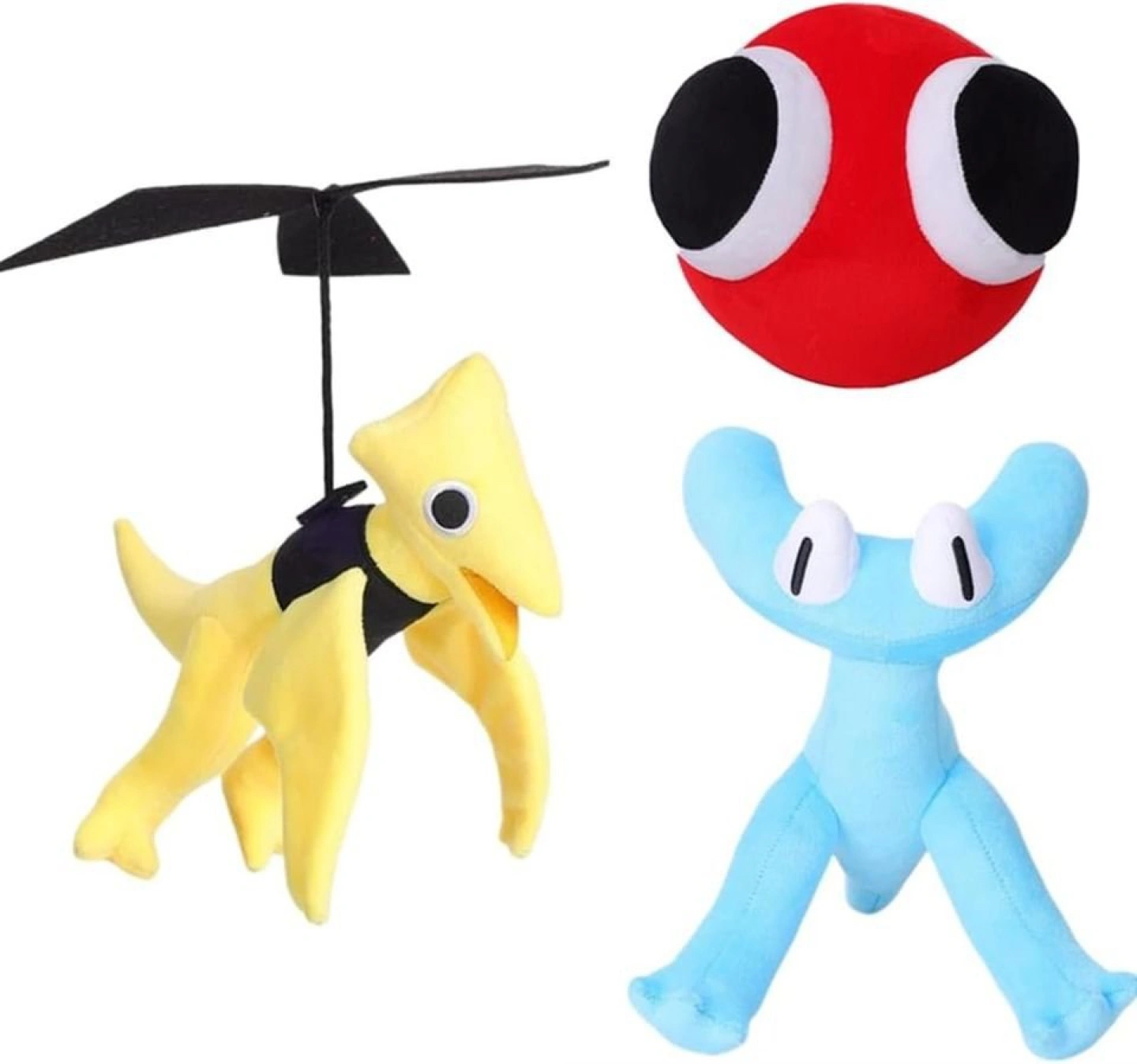 Collectible plush toy set. Includes a blue creature, a yellow pterodactyl with a rotor, and a red sphere with large eyes. Great for collectors or children. Soft and cuddly.