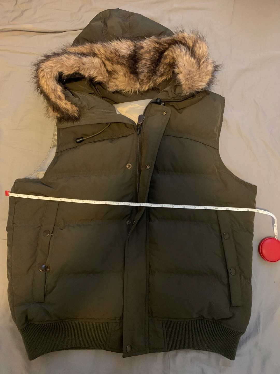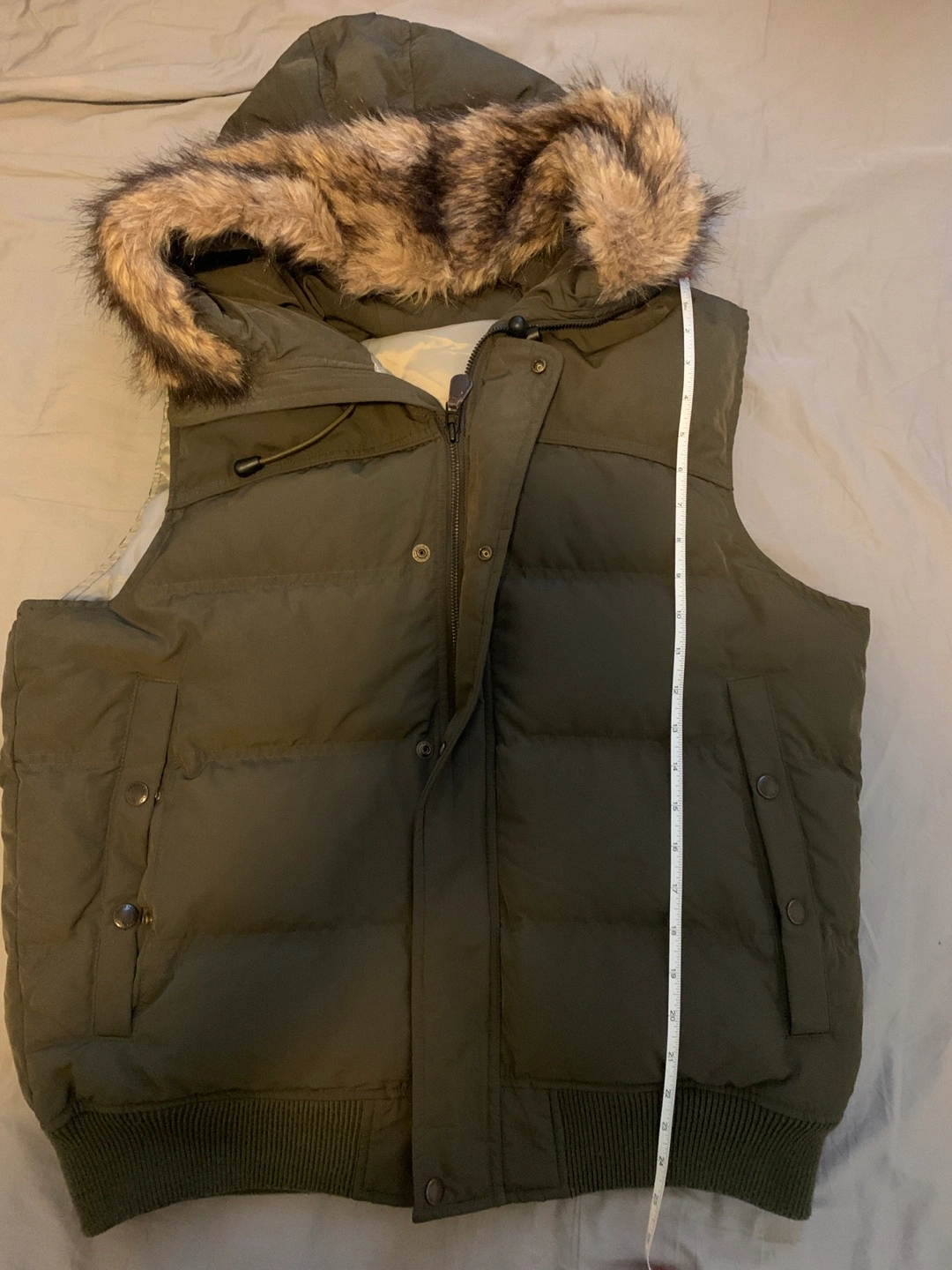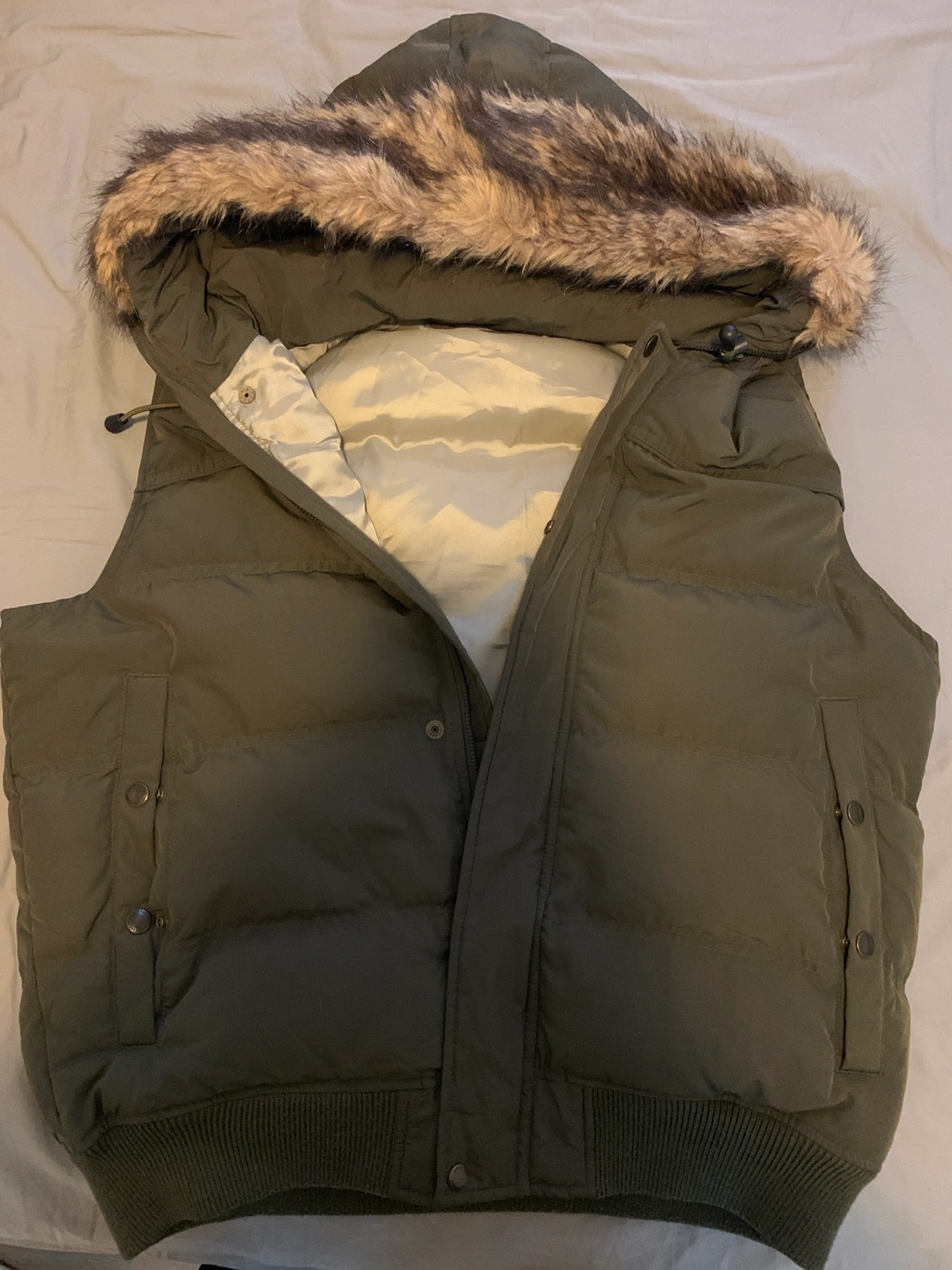 Warm olive green puffer vest. Features a faux fur lined hood and ribbed bottom hem. Multiple pockets. Great for layering.