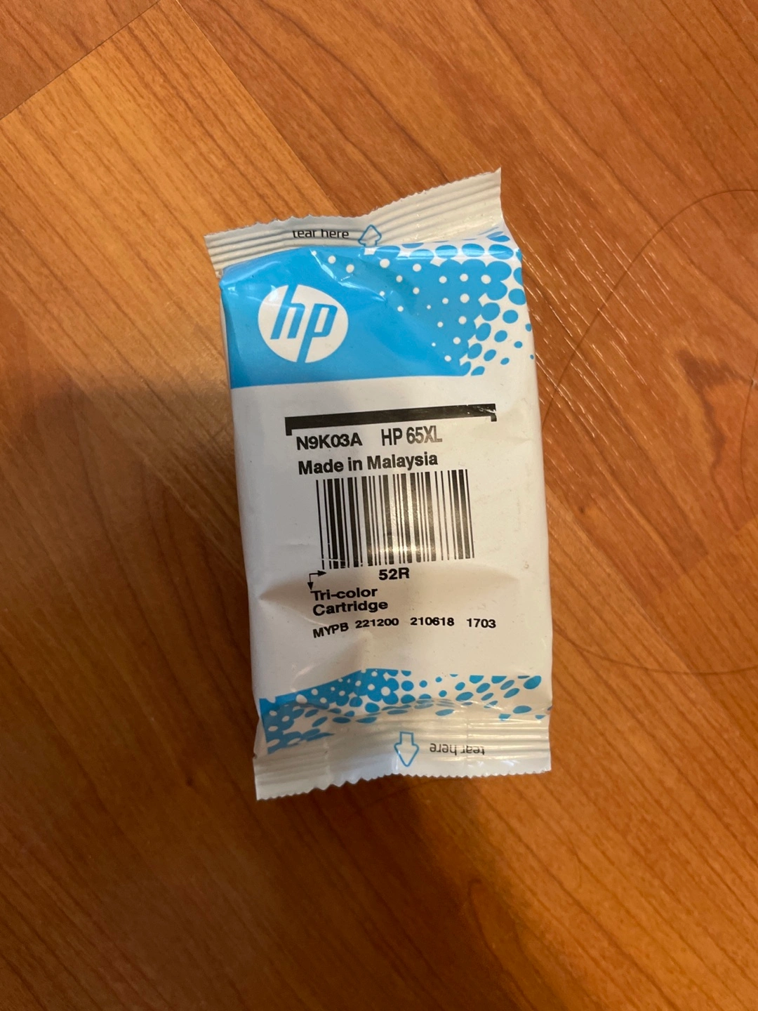 HP 65XL tri-color ink cartridge. Model number N9K03A. Made in Malaysia. New, unopened package.
