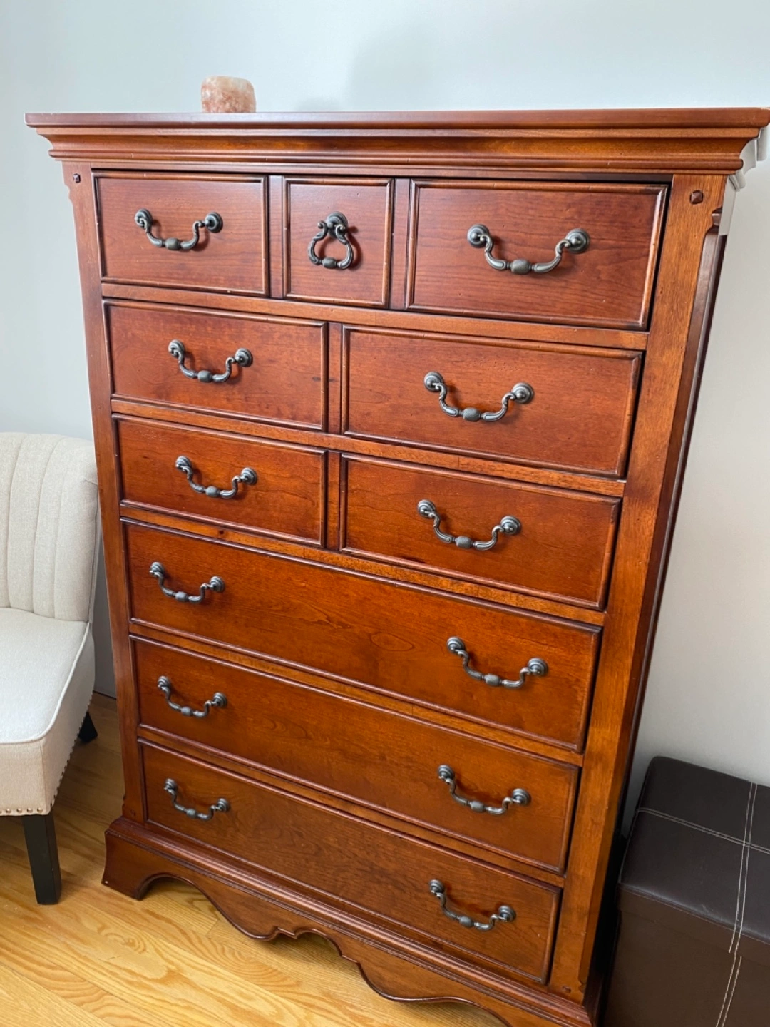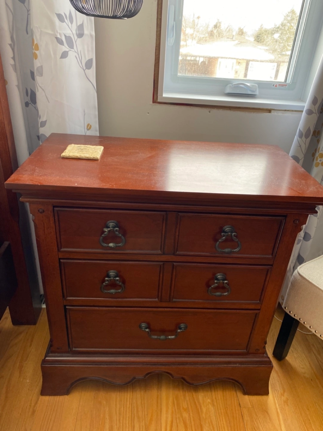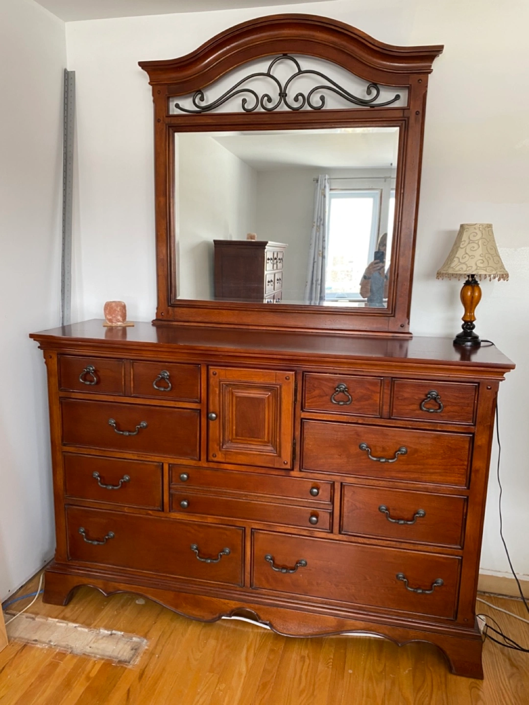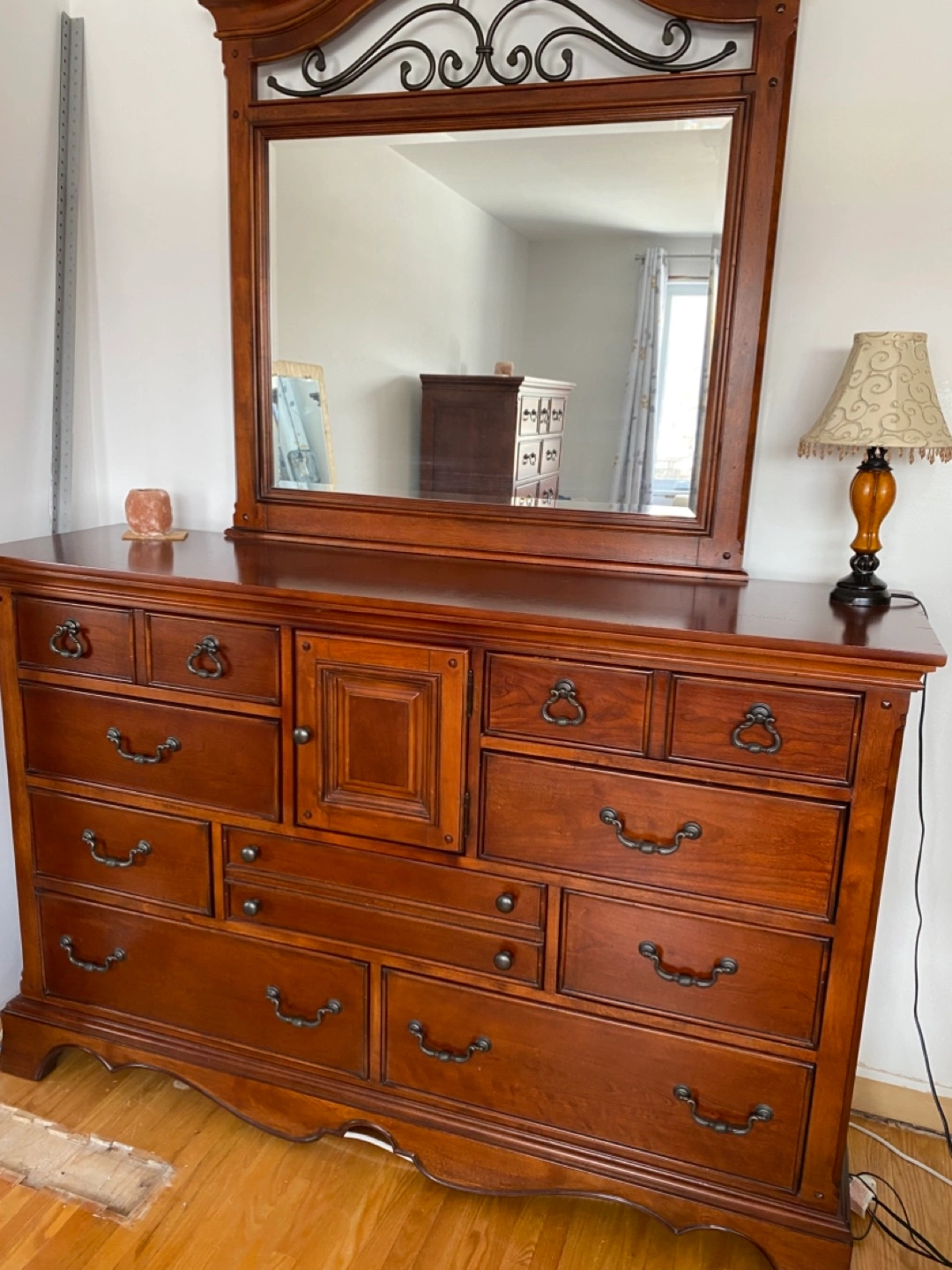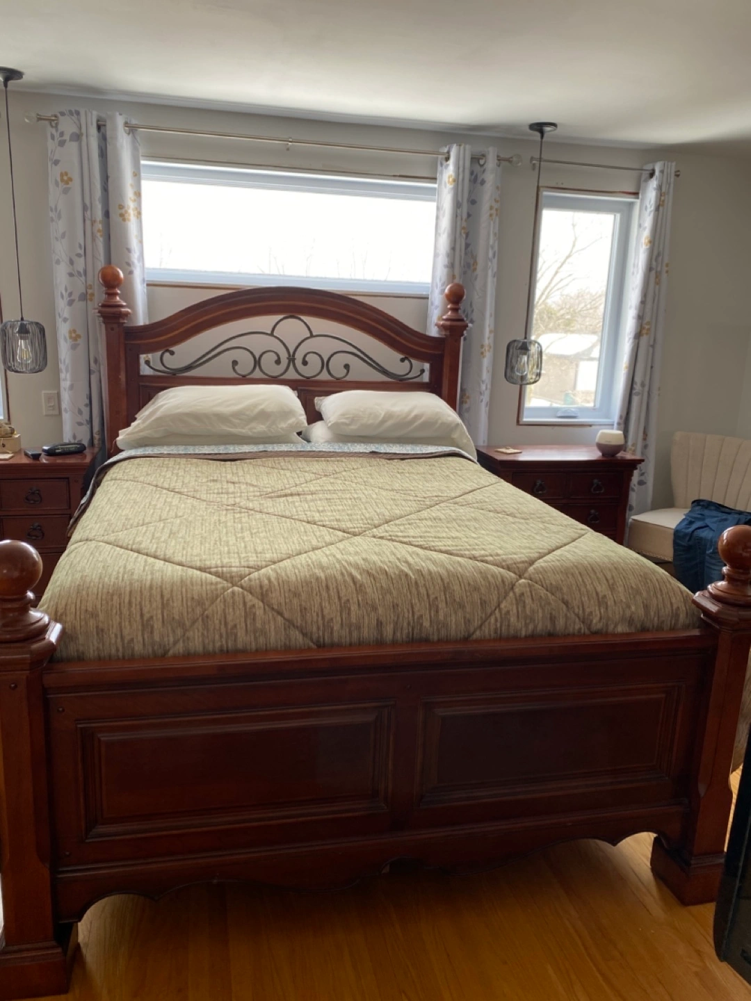 Dark brown wooden bedroom set. Includes a dresser with mirror 5’ 4” wide 18” depth and total height of 88.5” 2 nightstands 30” wide 16” depth and 30” height. Six drawer dresser, 40” wide 18” depth and 58” high. Bed frame is queen size 68” wide and headboard is 62” high. Ornate hardware. Excellent condition.