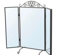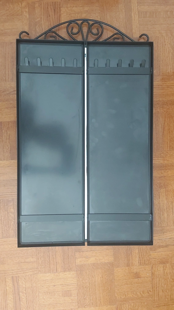 Tri-Fold Jewellery Mirror. Features multiple hooks for necklaces and earrings. Black metal frame. Measures approximately 23 inches in length and 20 inches in width when folded.