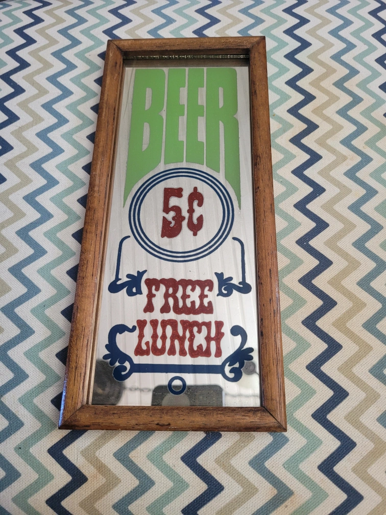 Framed mirror sign. Features retro graphics. Beer 5¢ and Free Lunch text. Great for bar or man cave.