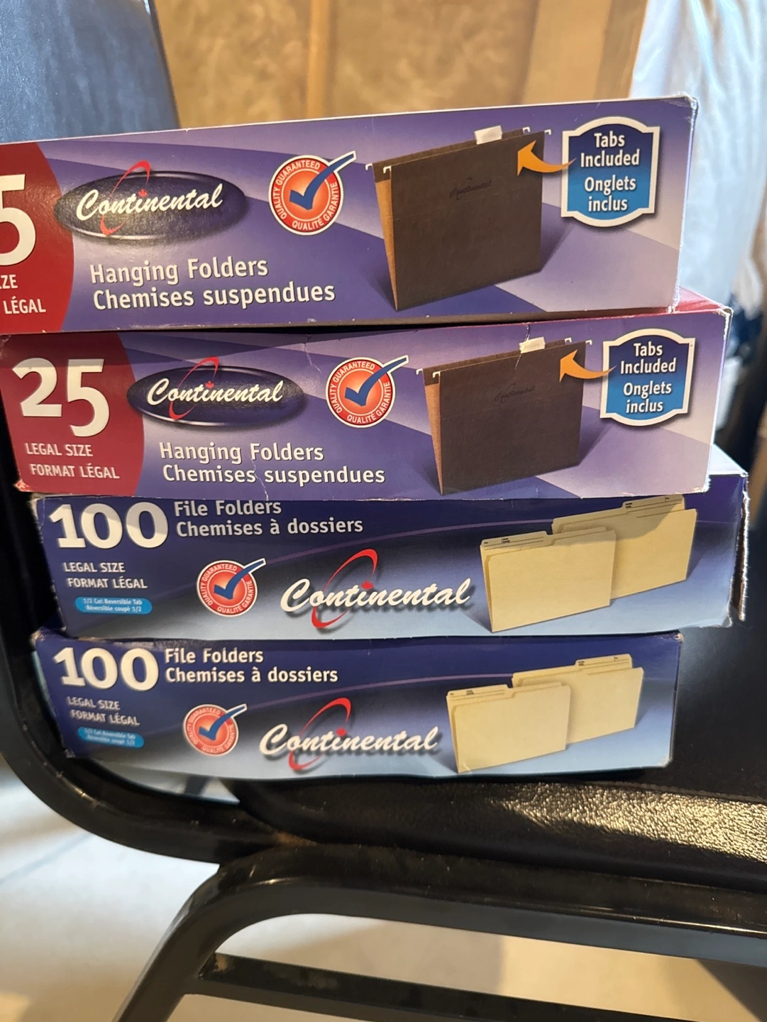 2x 25 count boxes of new Continental hanging file folders. Legal size. Tabs included. Multiple boxes available.
