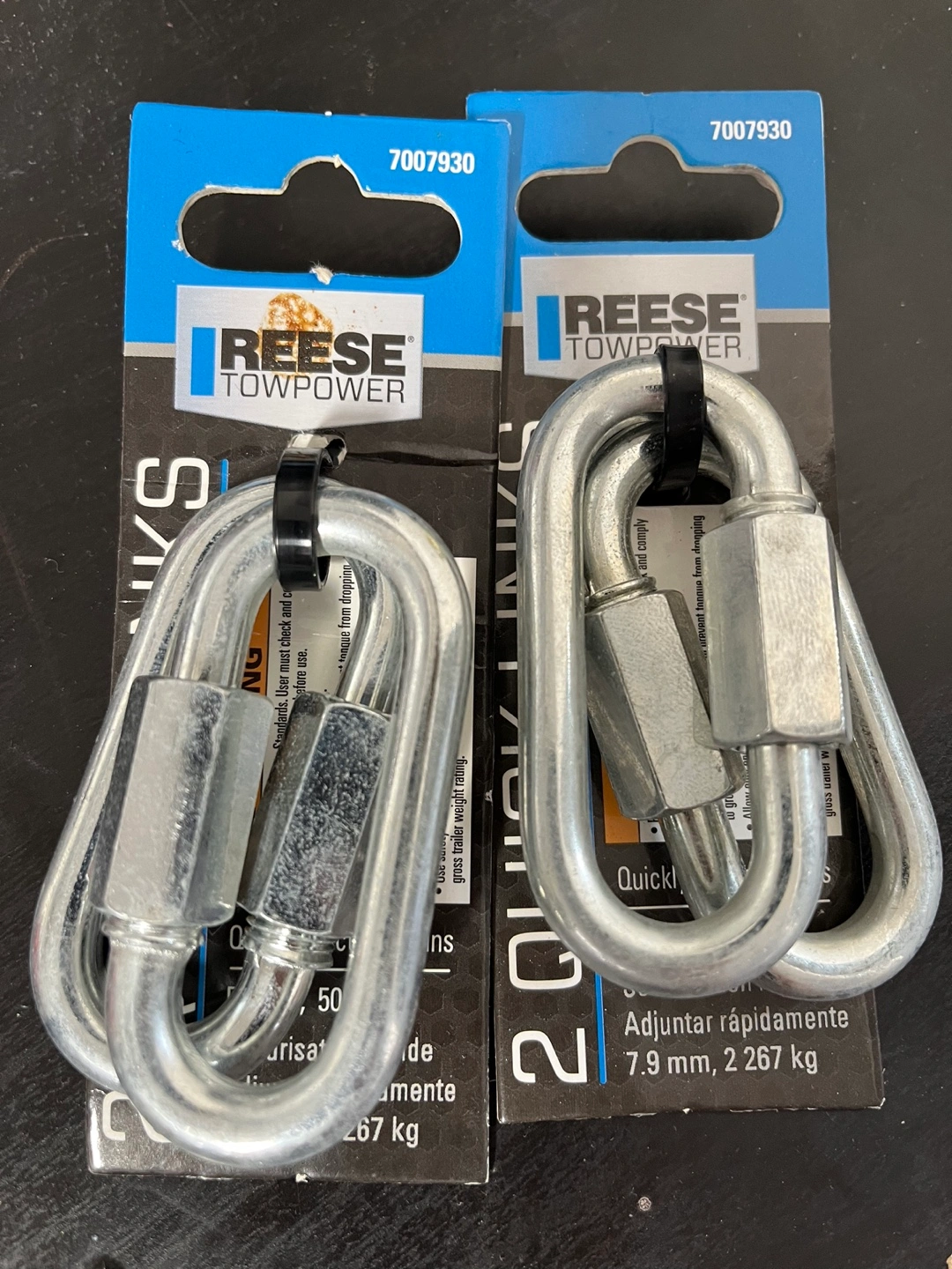 Two packs of Reese Towpower quick links. Metal construction. 7.9 mm, 2267 kg weight rating. Quick connect.