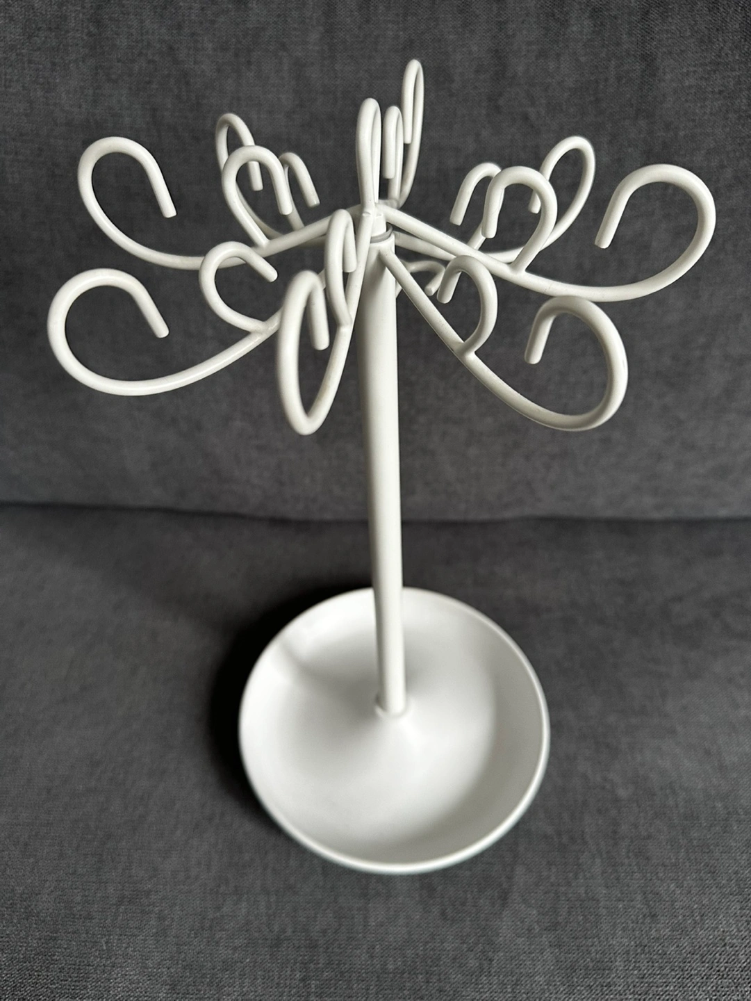 Stylish white metal jewellery stand. Features multiple hooks for necklaces and earrings. Circular base for stability. Perfect for organizing jewellery.
