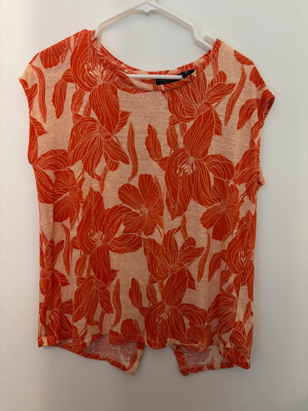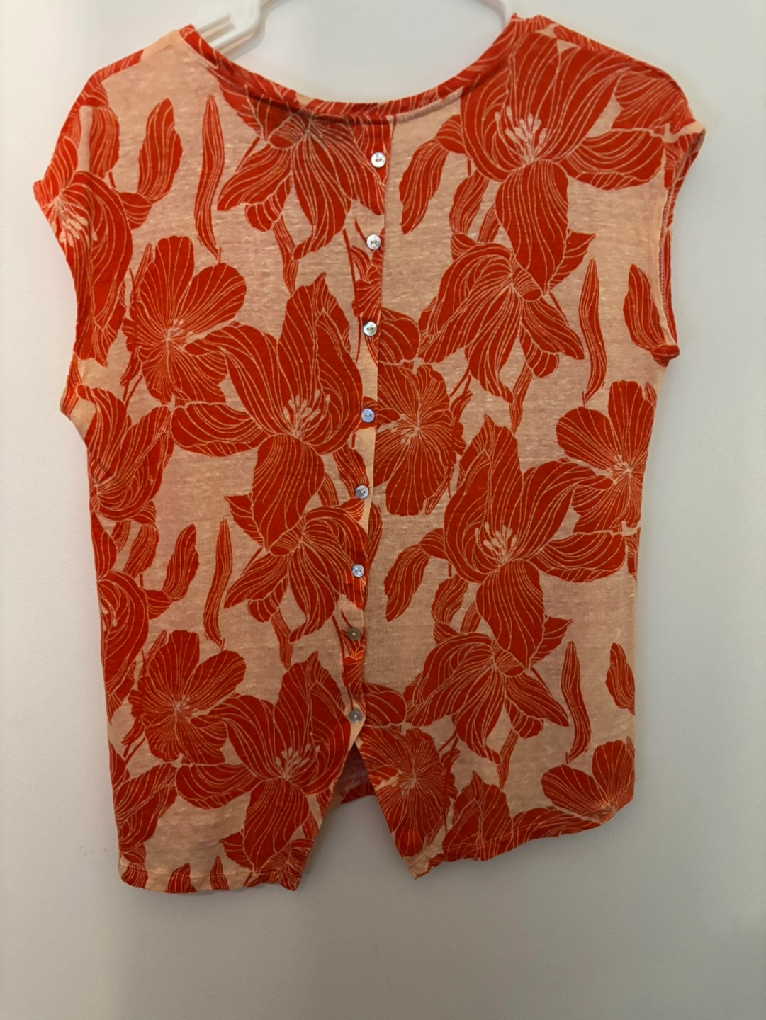 Women's short-sleeved Tahari top. Features a relaxed fit, floral print, and button detailing at the back. Linen material, 100 percent. Great for summer or vacationing. Size large. Cash only.