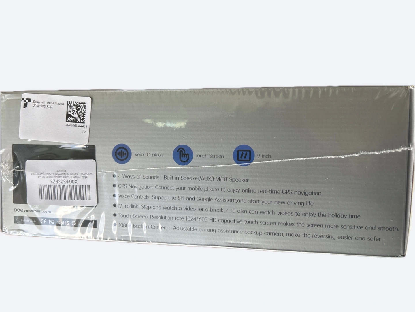 Brand new in box. 9-inch touch screen. Voice controls. GPS navigation. Built-in speaker. Connects to mobile phone. Adjustable parking assistance backup camera.