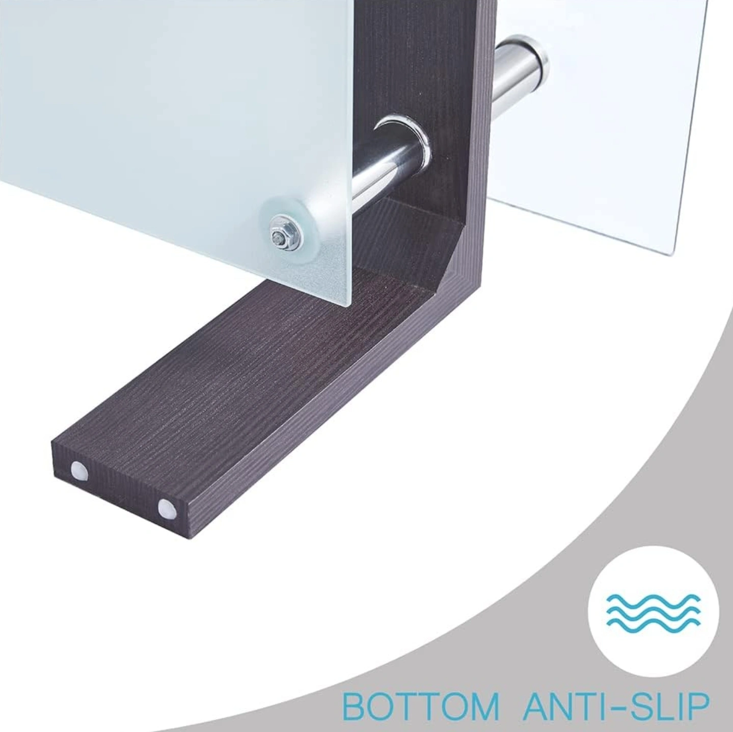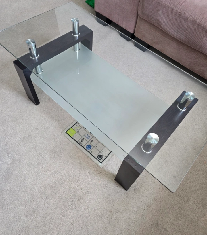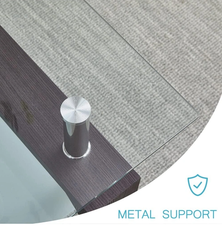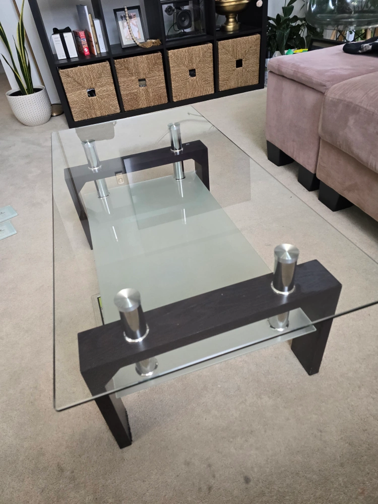 Stylish coffee table. Features a tempered glass top and shelf. Dark brown wood-look legs and chrome accents. Easy to clean.