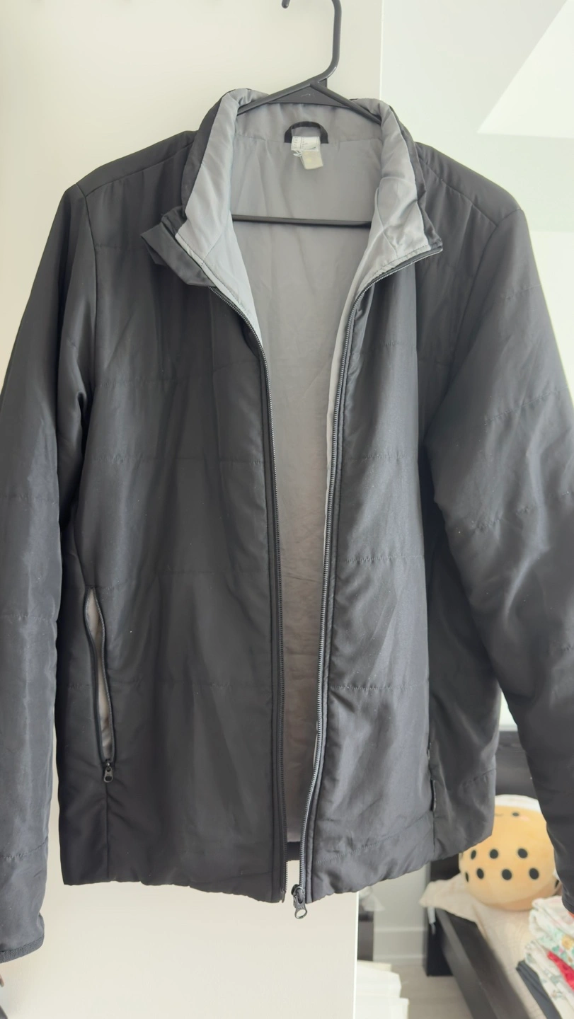 Men's size medium black insulated jacket. Features a full zip closure and grey interior. Lightly quilted exterior. Pet and smoke free house