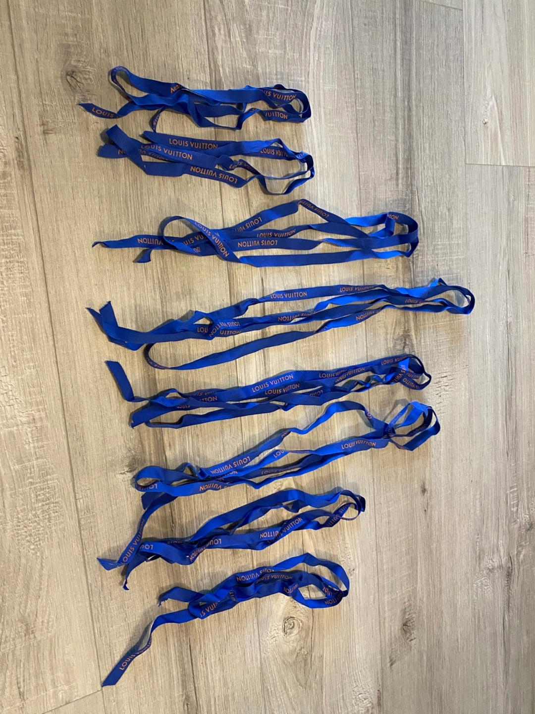 Assorted Louis Vuitton gift packaging. Includes ribbon, shopping bags, boxes, and smaller packaging inserts. Perfect for gifting or crafting.